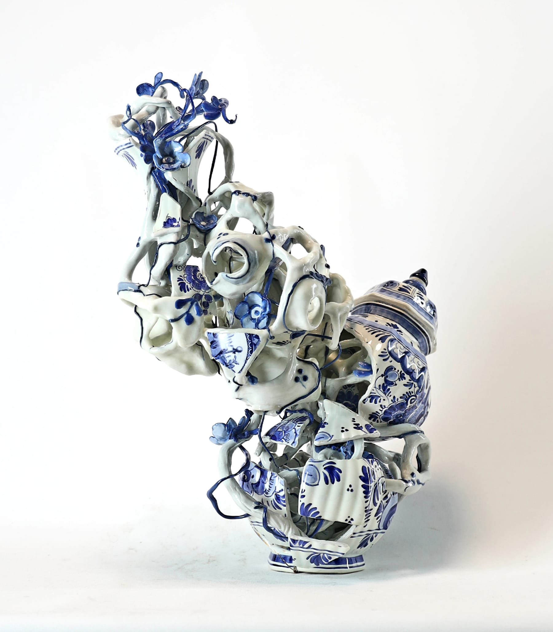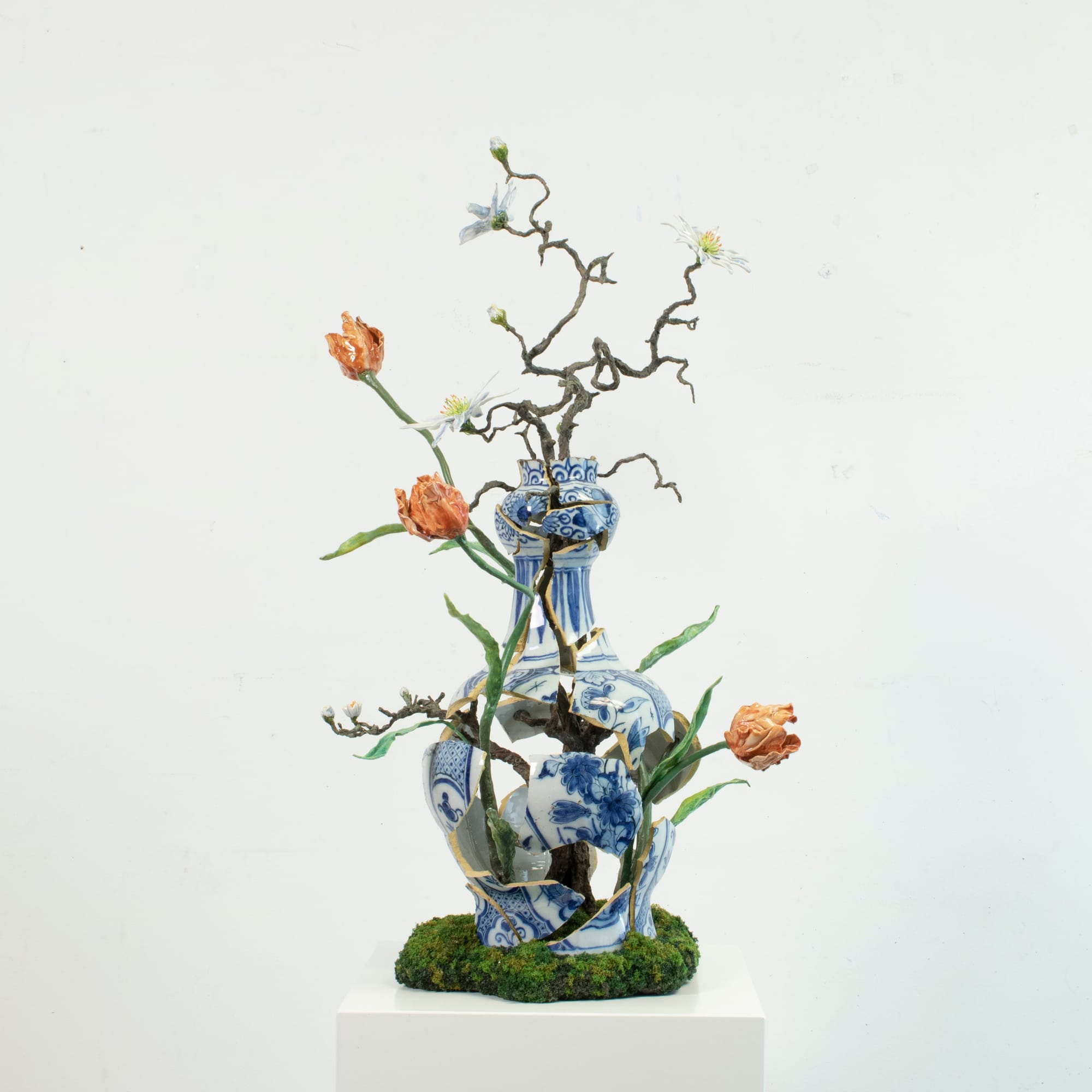 The moment when something breaks is always dramatic, but rarely does that sense of drama remain when a broken object is repaired. The sculptures of Dutch artist Patrick Bergsma, “exploded” porcelain vessel forms seemingly held together by simulated bonsai and other fauxliage elements, are a delicate balance of both states. His works literally shatter our expectations of traditional Delft blue pottery, which was directly inspired by and sometimes a direct replica of Japanese motifs and Chinese blue-and-white porcelain, generating unexpected and organic forms out of entirely inorganic materials that lend his sculptures a remarkable tension and gravity-defying quality.