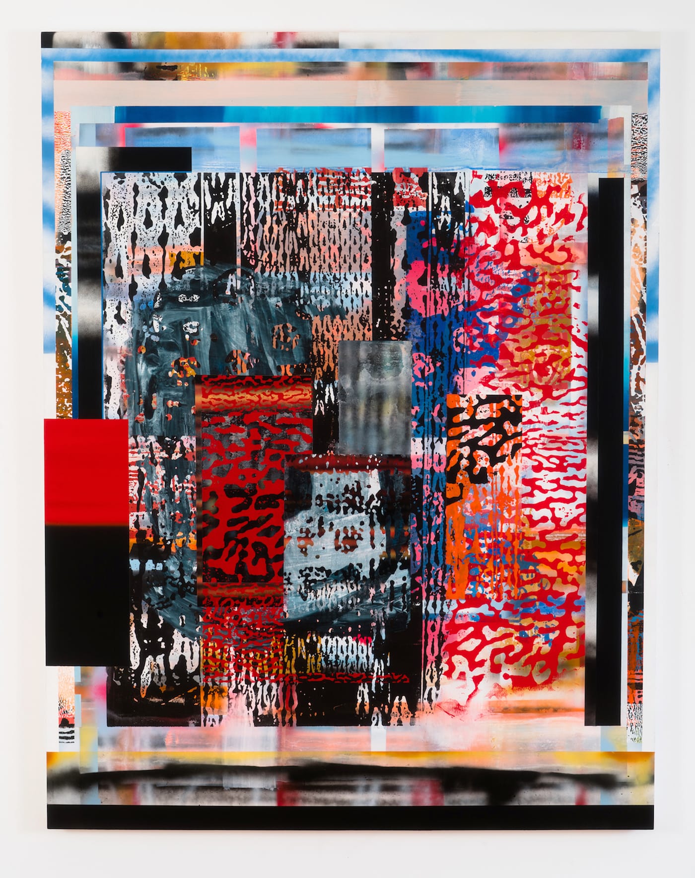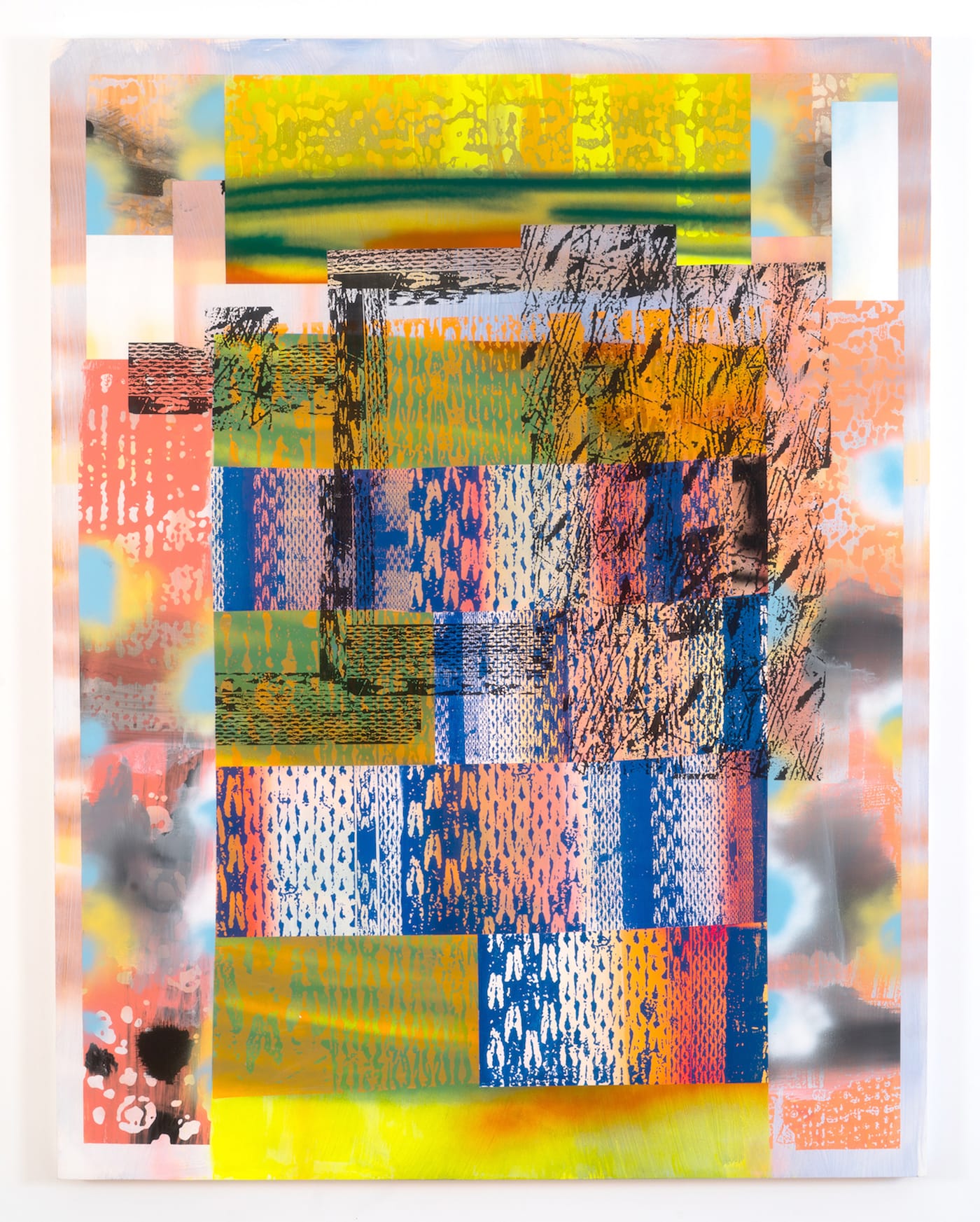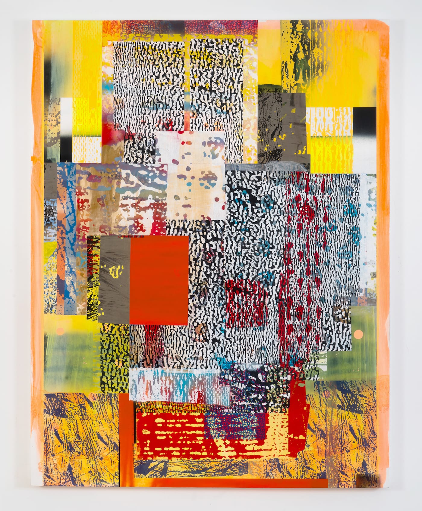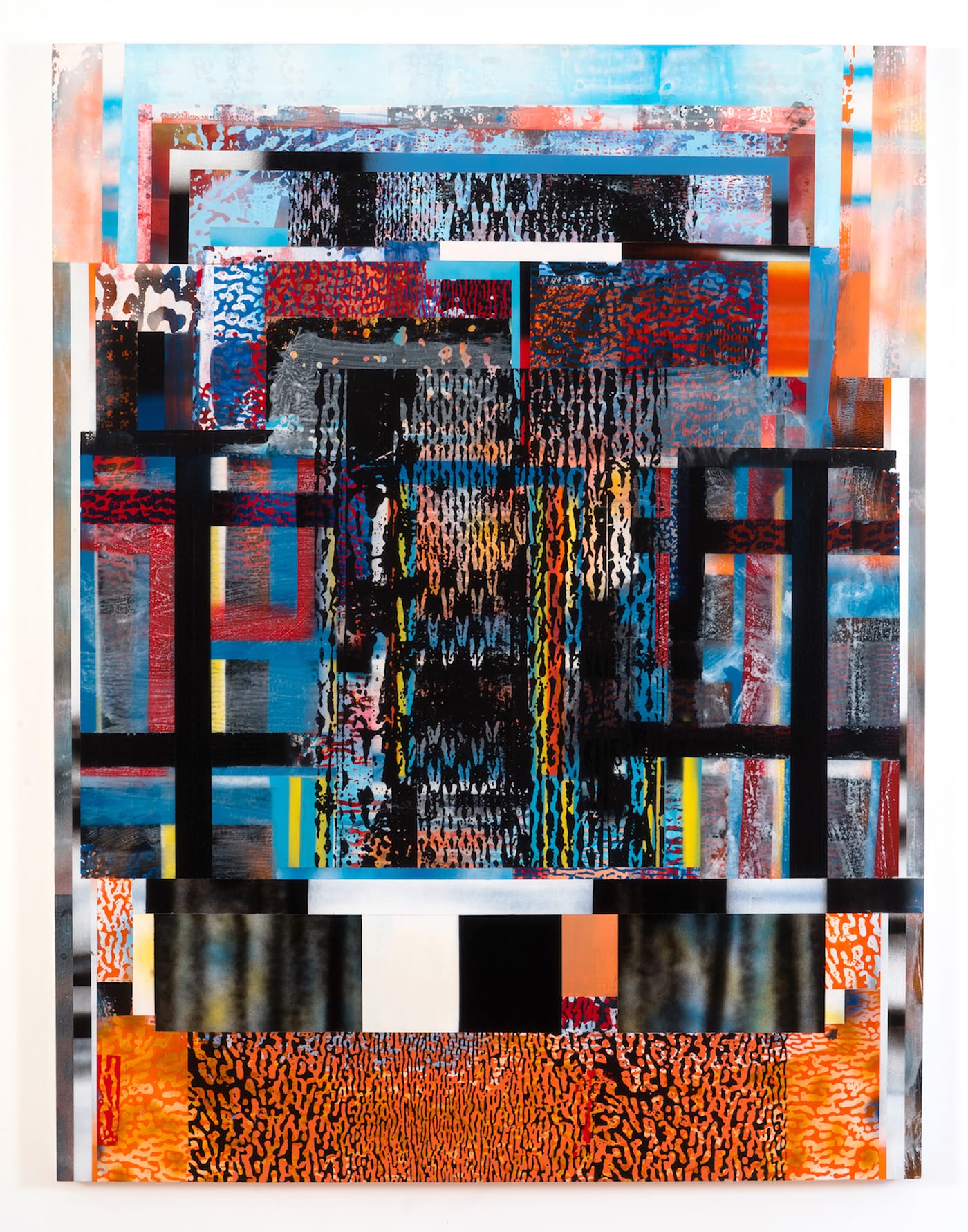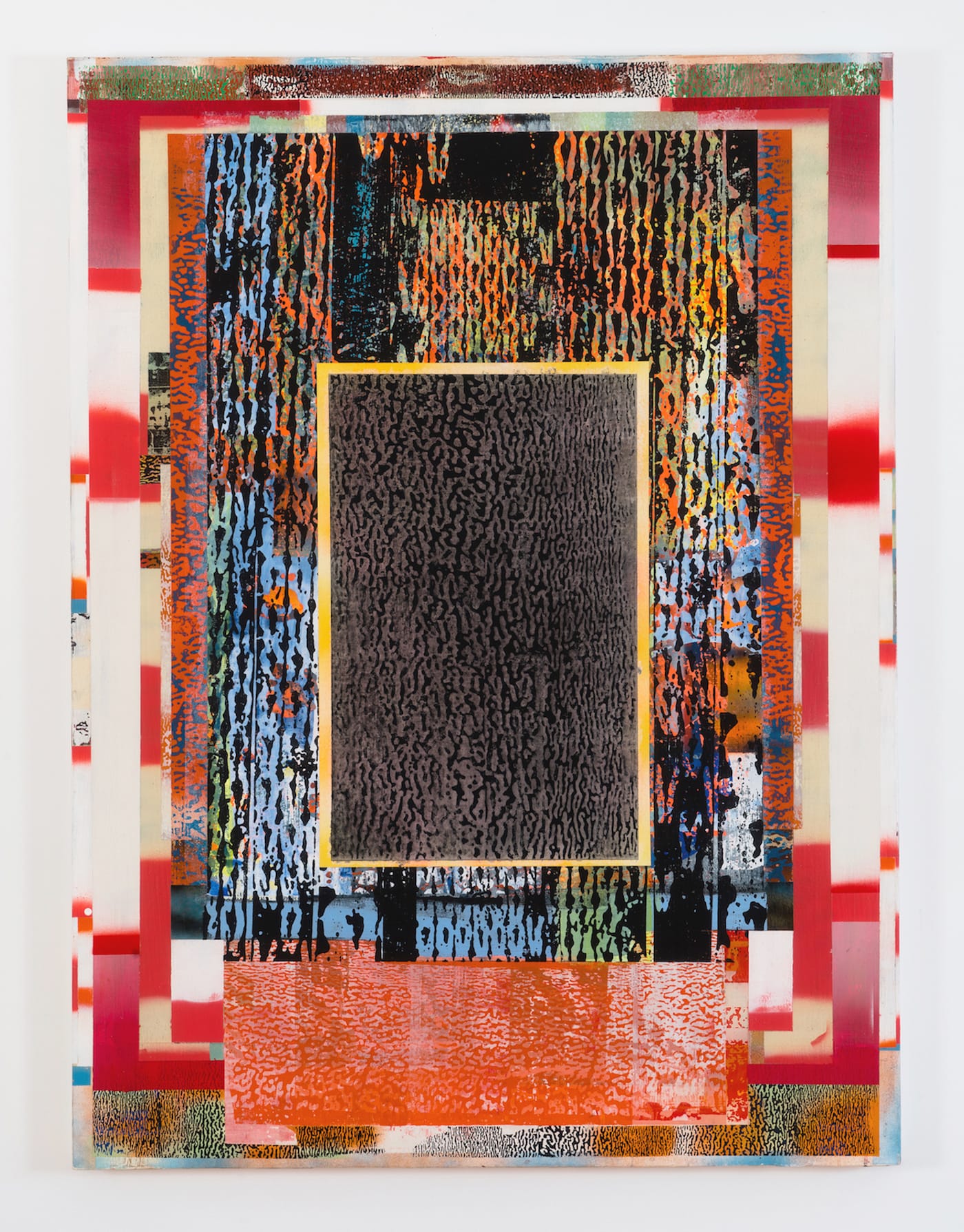 Berran’s palette combines full-throated primary and secondary hues with black, white and a range of grays. These colors are more or less opaque, but an illusion of transparency results from the visual porosity and interpenetration of the areas of pattern with the blocks of color behind them, rather than any actual translucency (of glazes, e.g.). These patterns bring the look and feel of photomechanical reproduction into the paintings’ space — particularly, one that appears on the surface to be rippled and pebbly, but is also much too smooth and regular to be derived from the tree bark or brain coral that it vaguely resembles. The imagery could be mistaken for a hundredth-generation photocopy of some arbitrary original. Another motif seems to be based on a magnified, high-contrast photo of knitted yarn.