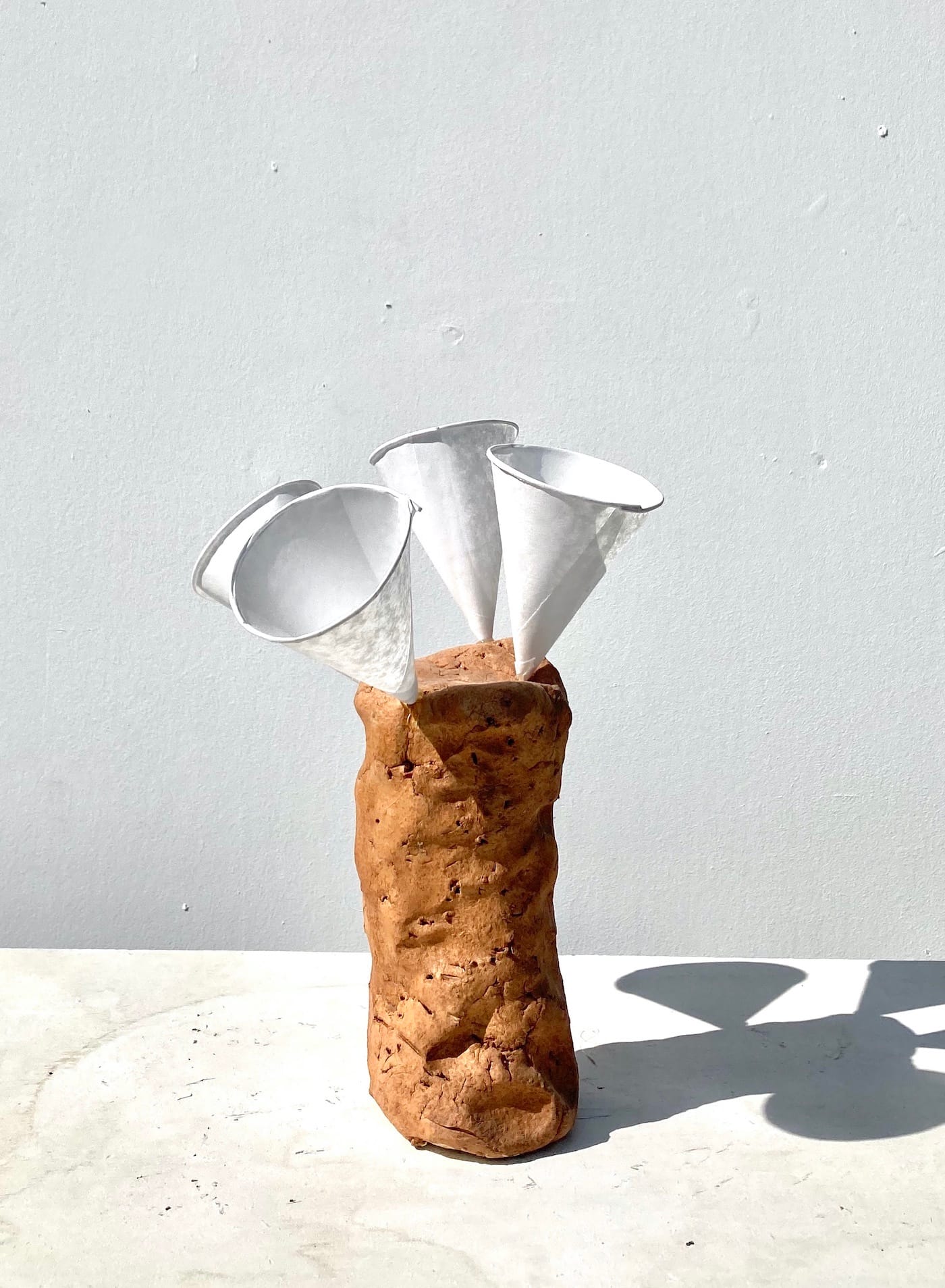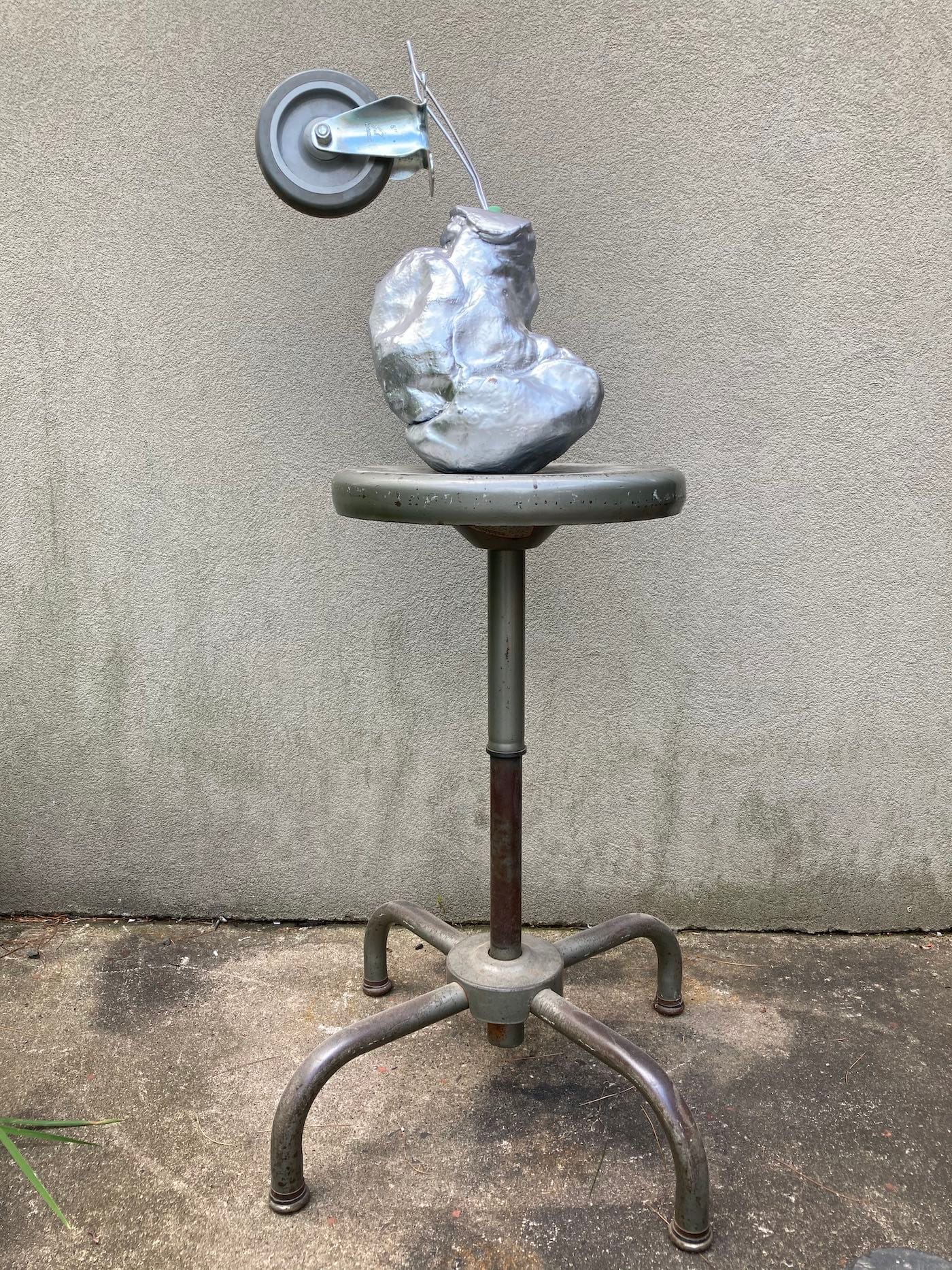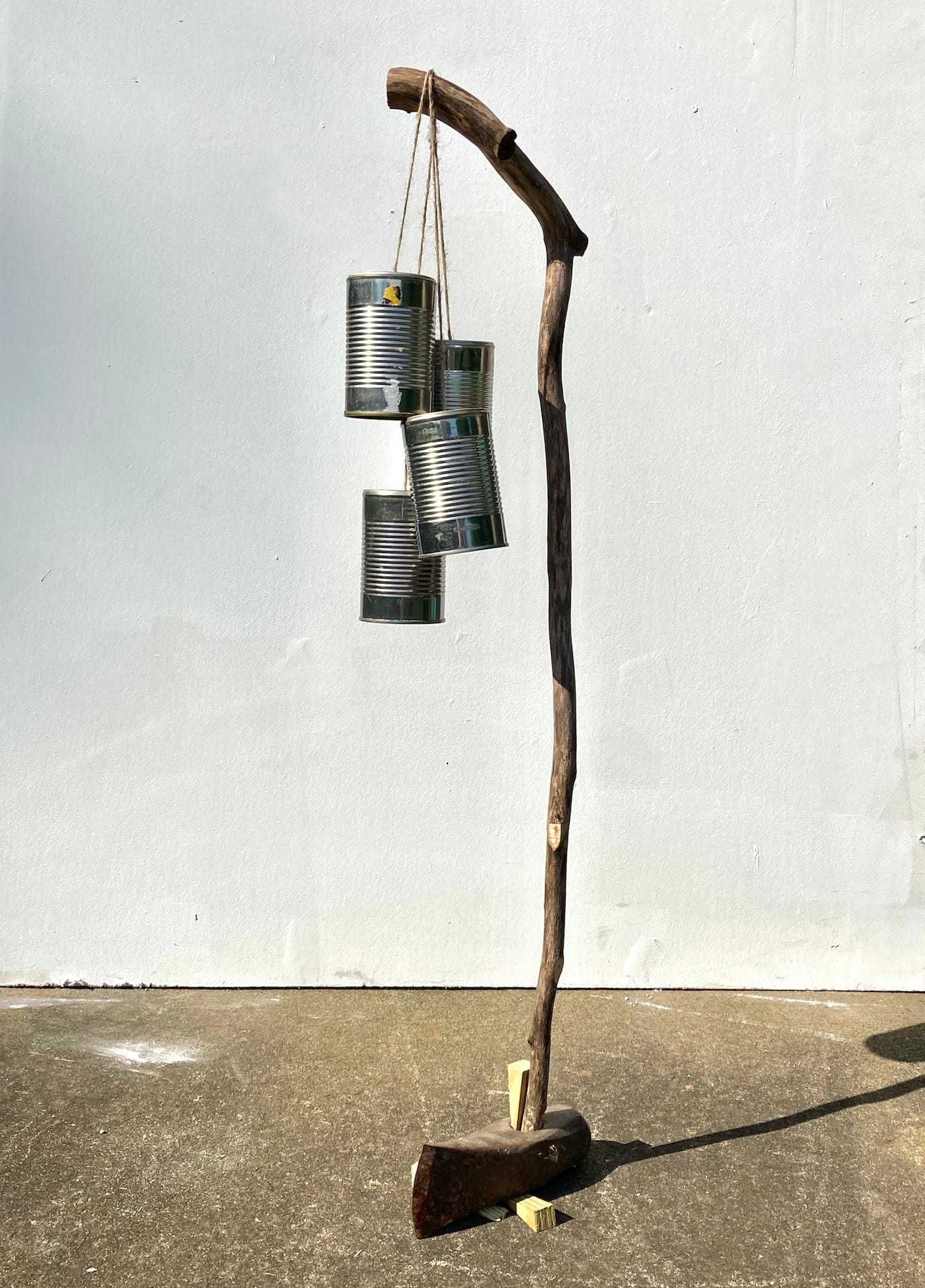 What aesthetic standards do you use to judge four conical cups — the kind that are dispensed at a water cooler — sticking out from the top of what looks like a cousin to a sweet potato? Why does the base remind me of Munster star Fred Gwynne’s extraordinarily long head? Are the cups radar receivers or hair curlers? What about the four metal cans dangling from a minimally carved and stripped branch, which has been inserted into a wedge-like base complete with shims to stabilize it? And what about the silver lump sitting on a metal stool, like a grade-school science fair model of an asteroid?