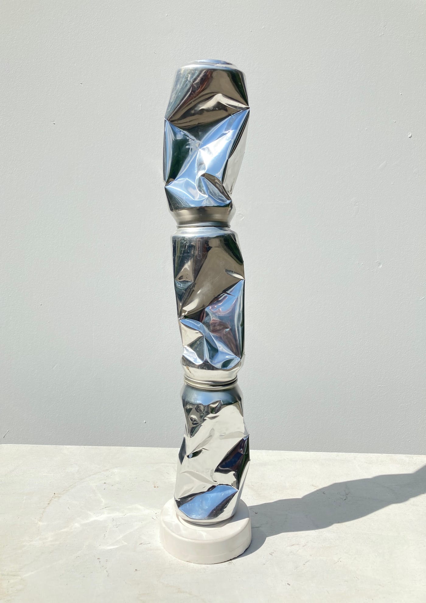 It is also clear that he is carrying on a lively dialogue with Constantin Brancusi, Alberto Giacometti, Hans Arp, and others without falling into parody or pastiche. A vertical stack of three shiny, crumpled cans speaks to Brancusi’s “Endless Column” as much as it does to the food hoarding of Covid time. This is what makes Strzelec’s whimsical work more than that: it is speaking to different periods, the past and present, and not just to formalism or aesthetics.