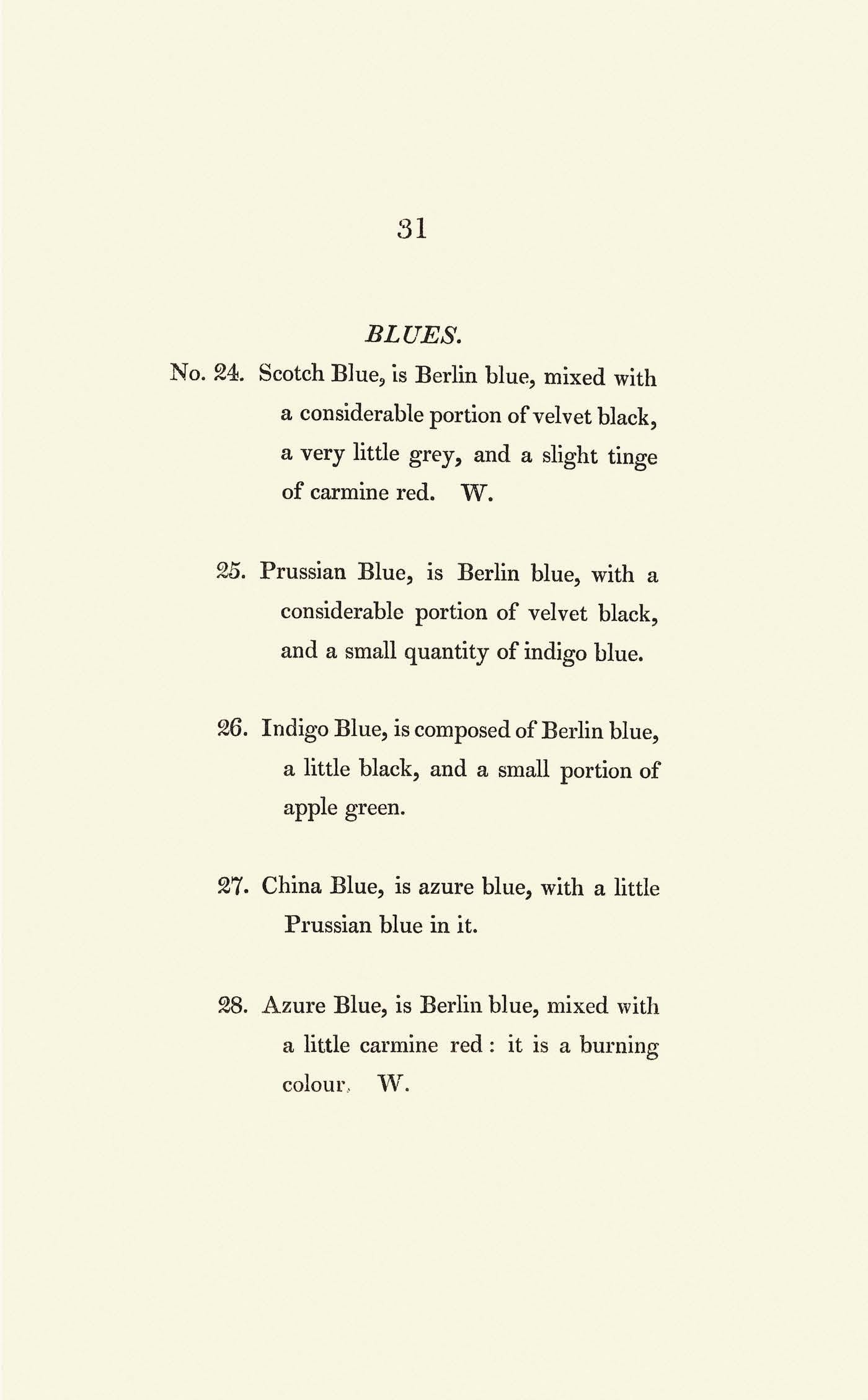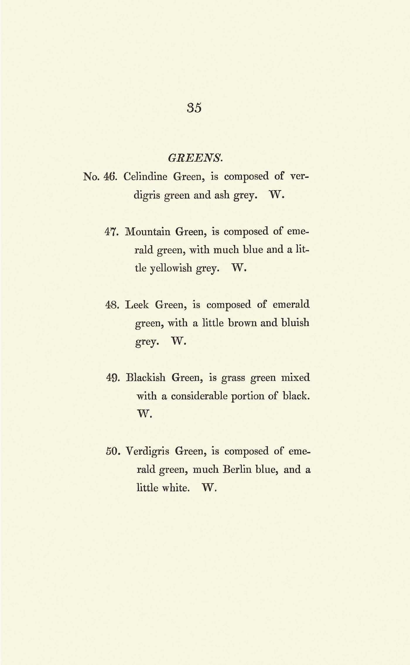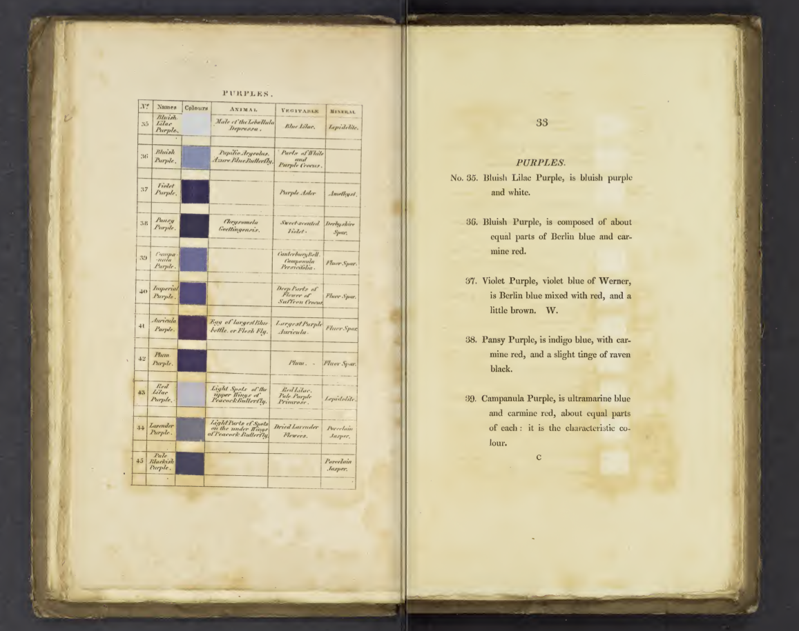 As its title suggests, Syme’s guide pieces together the work of another color taxonomist. Abraham Gottlob Werner, a German minerologist, had developed a standardized color scheme in the late 18th century to identify various shades in his geological specimens with precise and consistent language. Syme, who often painted flowers for Scotland’s national horticultural society, built on Werner’s research by adding floral and faunal references to describe the tints. He also added about 30 colors to those Werner highlighted, which he credited in the book by marking them with a “W.”