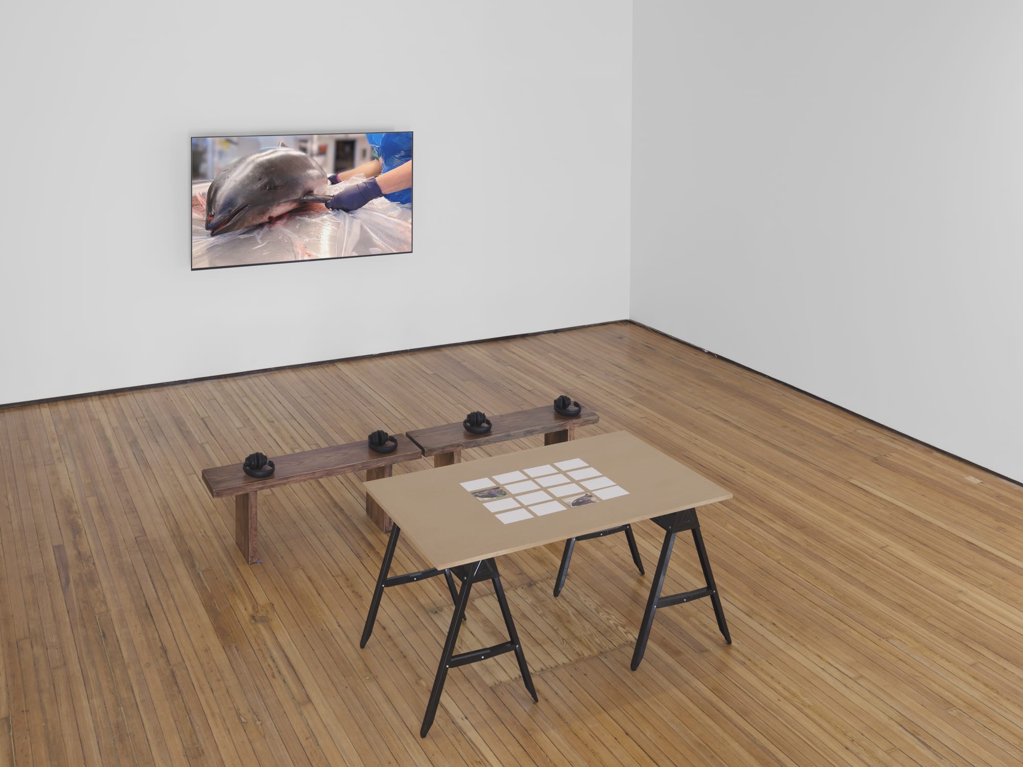We watch as a woman slices open a glossy black baby porpoise on a Microsoft Teams screen recording. Artist Patty Chang explains what we’re witnessing in a voiceover: Aleksija Neimanis, a scientist, is conducting necropsies on these animals to determine causes of death and help prevent further species loss. Chang and writer Astrida Neimanis are present in the virtual form of little video boxes on the screen — three mothers and a baby, the artist notes. The video installation “We Are All Mothers” (2022), part of Chang’s exhibition Touch Archive at Bank, meditates on motherhood, and more broadly, on empathy, connection, and violence across space, species, and time.