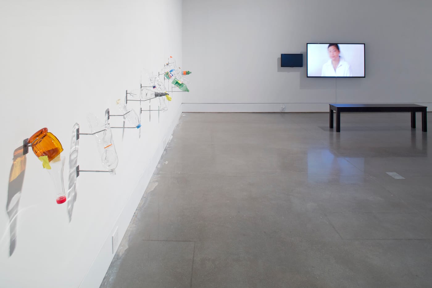 The contiguity of the personal and ecological is most acute in a series of thirty-two sculptures of female urinary devices. Produced with Amy Leclaire at UrbanGlass in Brooklyn, the bong-like silicate glass sculptures resemble the portable urinary devices that Chang improvised out of plastic bottles on her travels. On a nearby wall, film footage of her urinating through one such device pops up briefly in Configurations (2016); in an adjacent room, a discordantly bright and airy photograph, “Configurations (bottles)” (2017), shows a dozen plastic bottles filled with urine from her travels. As with photographs of breast milk, taken while Chang was weaning her infant son, these sculptures and images document the traces of Chang’s bodily fluids and implicate them, by context, in larger ecologies of loss, waste, and sustenance.