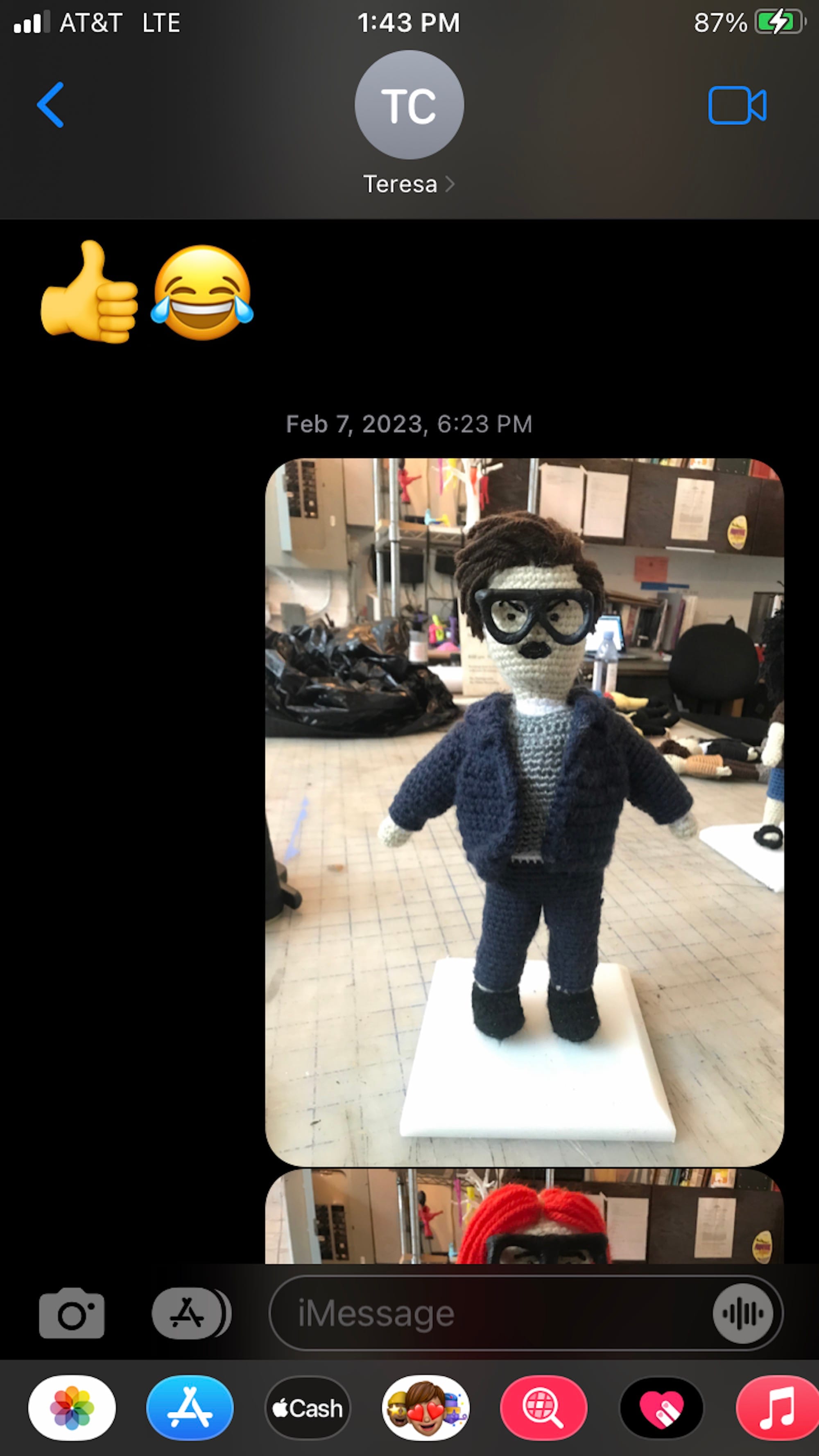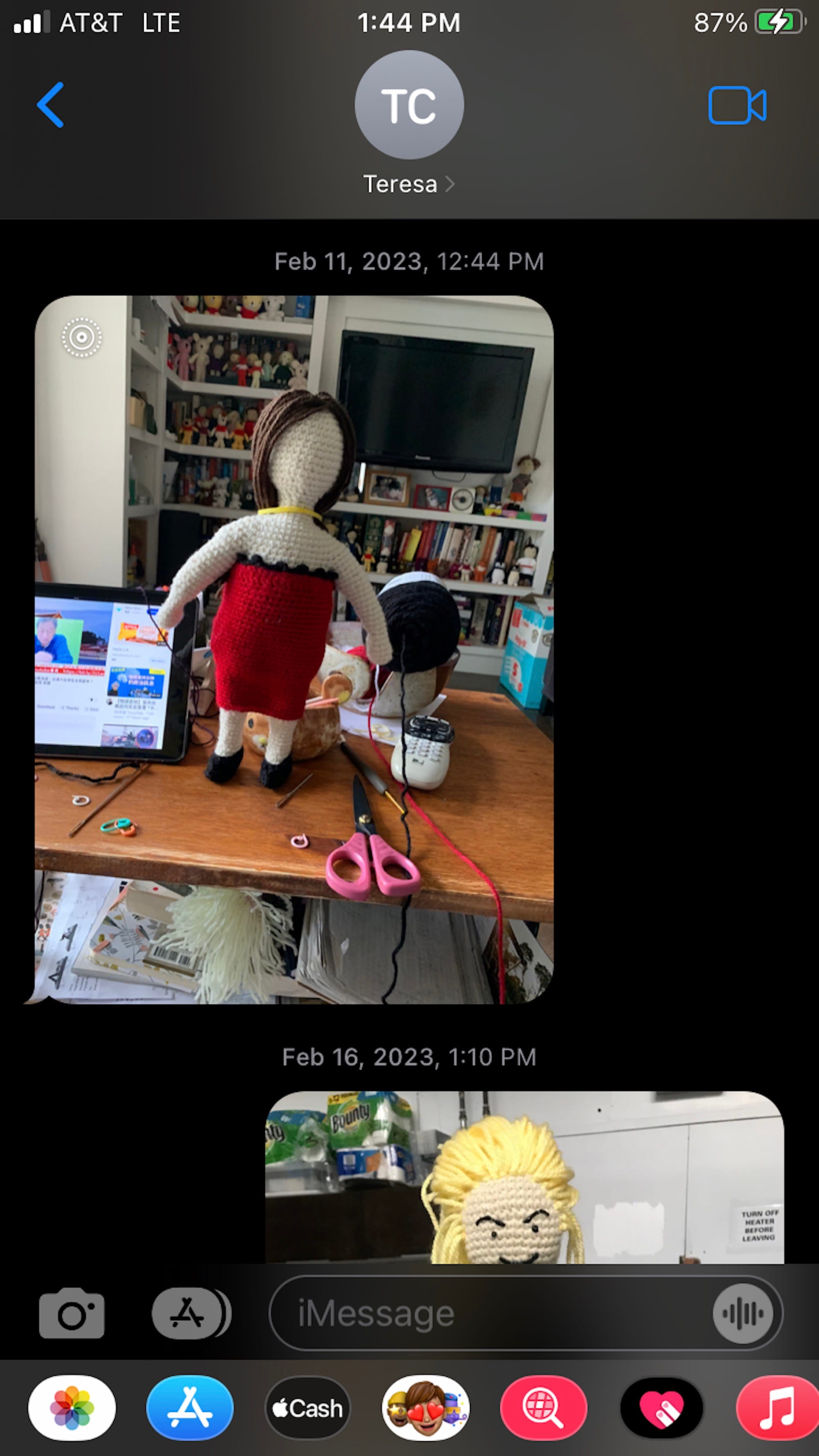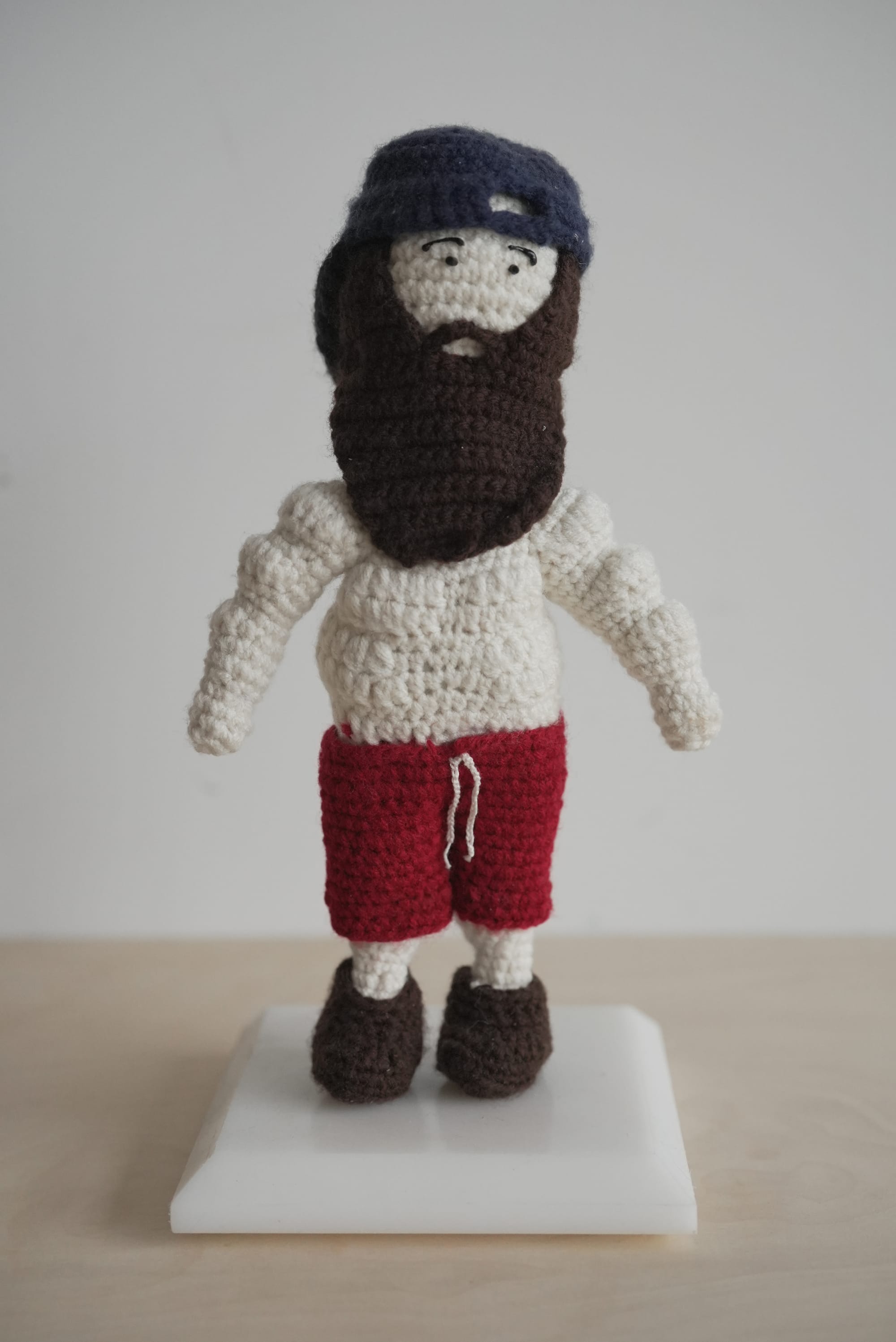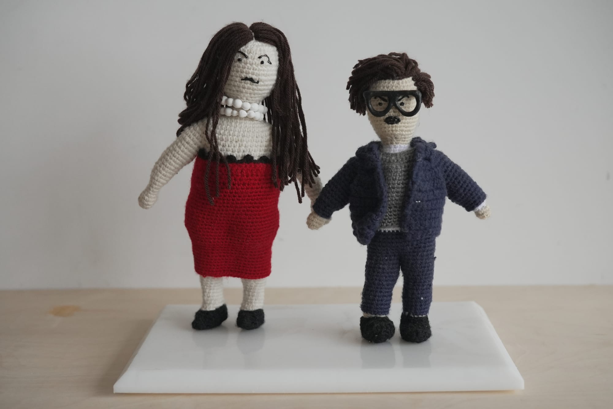 “We’ve been doing it like this since,” Chan explained. He comes up with a sketch of an infamous figure he thinks would make an interesting subject, and then the two of them chat on the phone (or “game it out,” in Chan’s words). Sometimes his mom thinks the shape of the figure should change, or else she just wants a challenge, “like knitting high heels.” They settle on colors. When she’s done, she mails the approximately 9–to-14-inch figures to him from her home in Los Angeles and Chan adds the finishing touches: a face, hats, eyewear, prison ankle bracelets.