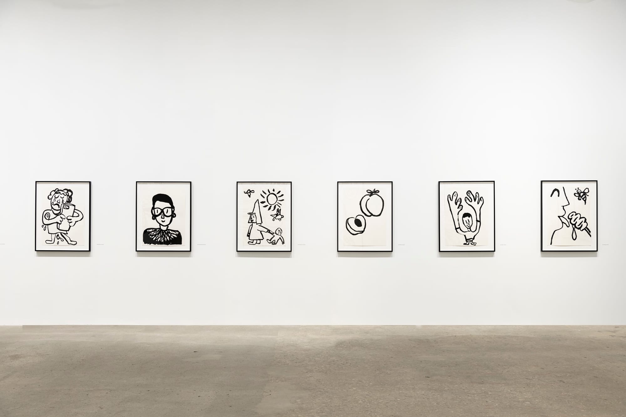 Badlands Unlimited, the press founded by artist Paul Chan in 2010, recently released the first-ever English translation of Wittgenstein’s dictionary. The cartoonish brush and ink drawings that Chan made to illustrate the terms — using his non-dominant hand, a learning exercise — are now on view at Greene Naftali. The childlike drawings are characterized by a sense of receptiveness, as if Chan, guided by the dictionary, allowed associative images to rise to the surface in an experiential exploration of how meaning is made. For the word “culture", Chan playfully drew admirers snapping pictures of his own inflatable "breathers", exhibited by the gallery last year; for “lawyer”, he depicted the beloved late Supreme Court Justice Ruth Bader Ginsburg.