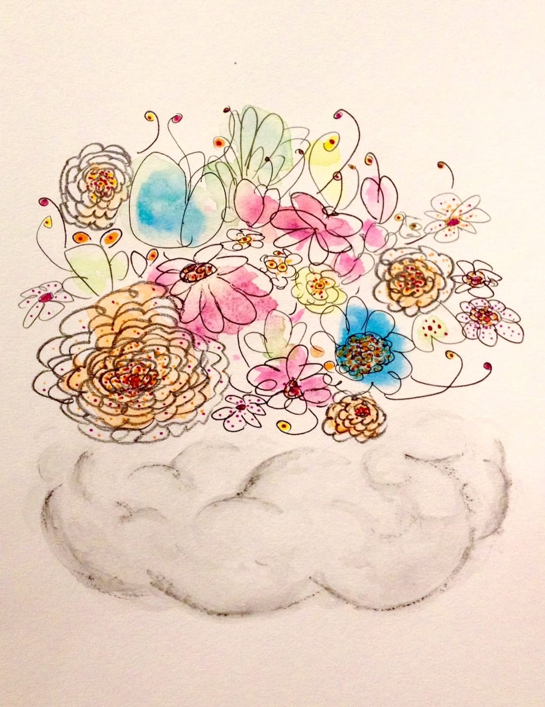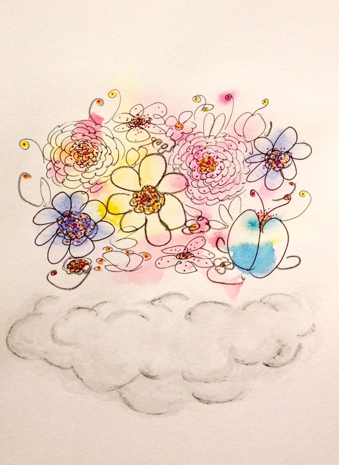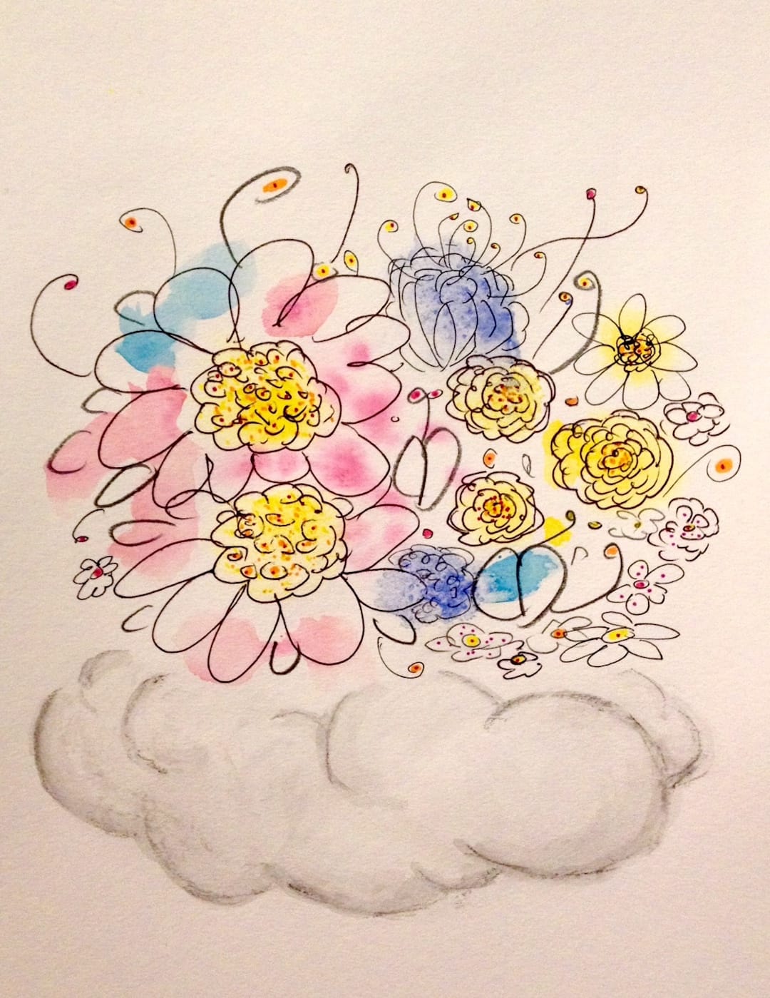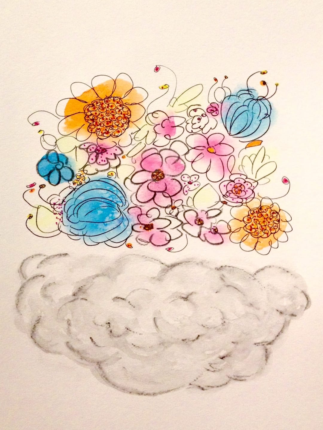 But I still didn’t feel like putting words on these drawings. I just felt like toying with the image of thick ‘happy’ clouds having flowers blooming out of them. ‘Better than silver linings,’ I thought.