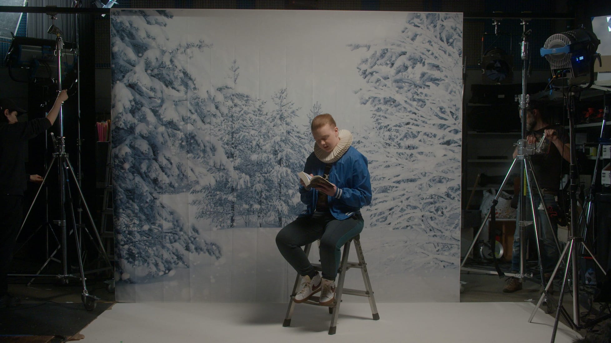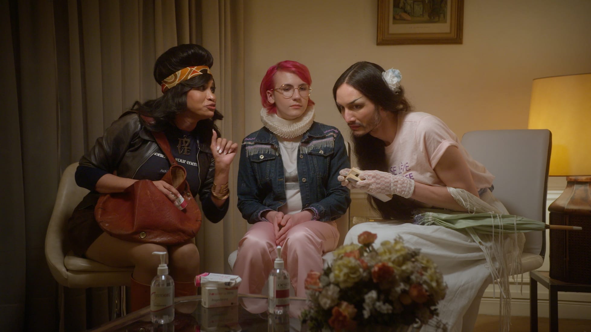 The film oscillates through time as each participant becomes a version of Orlando. “I’m Janis Sahraoui,” declares the first protagonist, dragging a roller suitcase through a dappled wood. “In this film, I’ll be Virginia Woolf’s Orlando.” Pairing a frilly ruff with a wide array of streetwear, the Orlandos role play vital scenes from the novel, bringing the original text into contemporary contexts, often for comedic effect. Mingling dialogue from the book between Orlando and Queen Elizabeth with a contemporary exchange with a psychiatrist (played by acclaimed actor Frédéric Pierrot), Liz Christin's Orlando dismisses the idea that their trans identity has any connection to how they were raised. “Would you say your father is masculine?” asks the shrink. “Yes, very masculine,” Orlando retorts with smirk. “He went on the Crusades and brought back a lot of Moorish heads.”