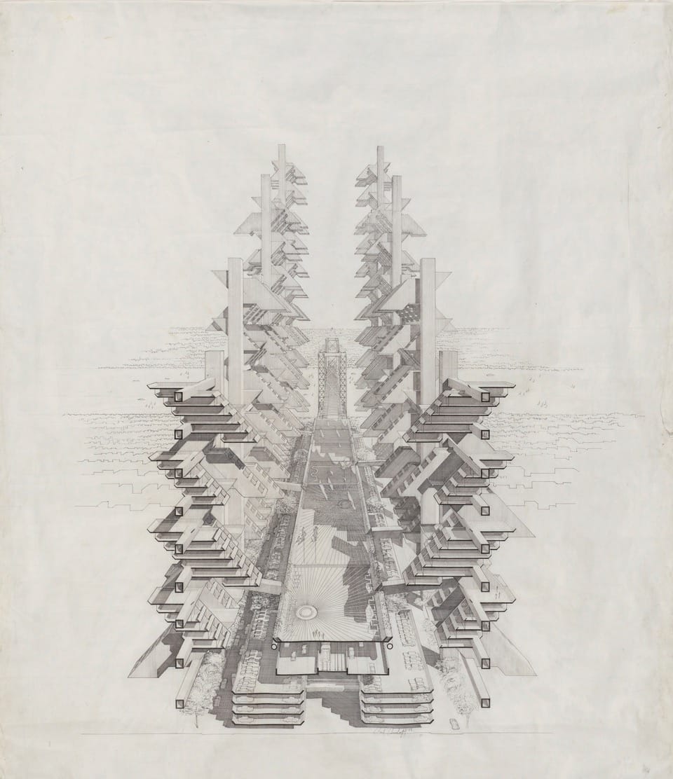 In 1967, Rudolph accepted a commission from the Ford Foundation to create an alternative proposal for urban planner Robert Moses’s Lower Manhattan Expressway, often breezily referred to as “LOMEX.” The resulting plan, represented in four large drawings, was a vision in line with the development-minded ethos of the era that would have created thousands of units of housing at the cost of radically altering the fabric of the neighborhoods in its projected path. Instead of Moses’s city-bisecting elevated 10-lane highway, Rudolph’s scheme opted for a less disruptive below-grade roadway, a “two-mile building” that linked the Holland Tunnel with the Williamsburg and Manhattan bridges with A-framed blocks of modular housing built atop. Rendered in “Perspective drawing of the Lower Manhattan Expressway / City Corridor project (unbuilt), New York” (1967–72), the hub is a fantasia of urbanity, with extravagantly cantilevered monorail tracks arcing out over the inescapable, if tastefully hidden, highway and surrounding interchanges.
