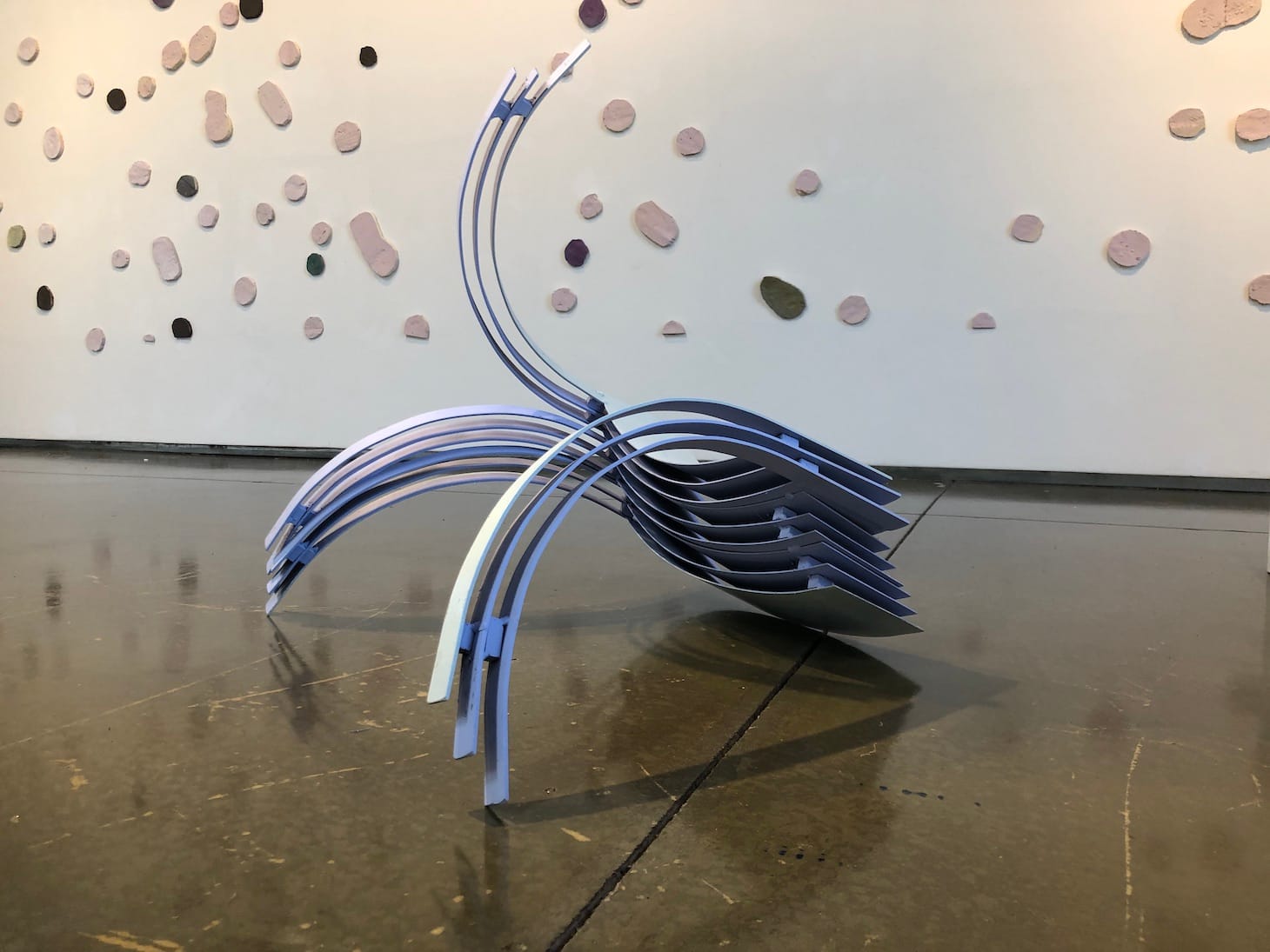 “Moon Pie” occupies center stage at the exhibition: a giant, free-hanging disk nearly ten feet wide. Although made of long, thin nails bristling from a frame of steel mesh, it has a curiously approachable quality. The nails (known as landscape ties) are bent, as if part of a natural system: perhaps stiff fur that’s been rubbed in a certain direction. According to curator George Brugnone, visitors often ask to “pet” it (permission is given, with a warning to be careful).