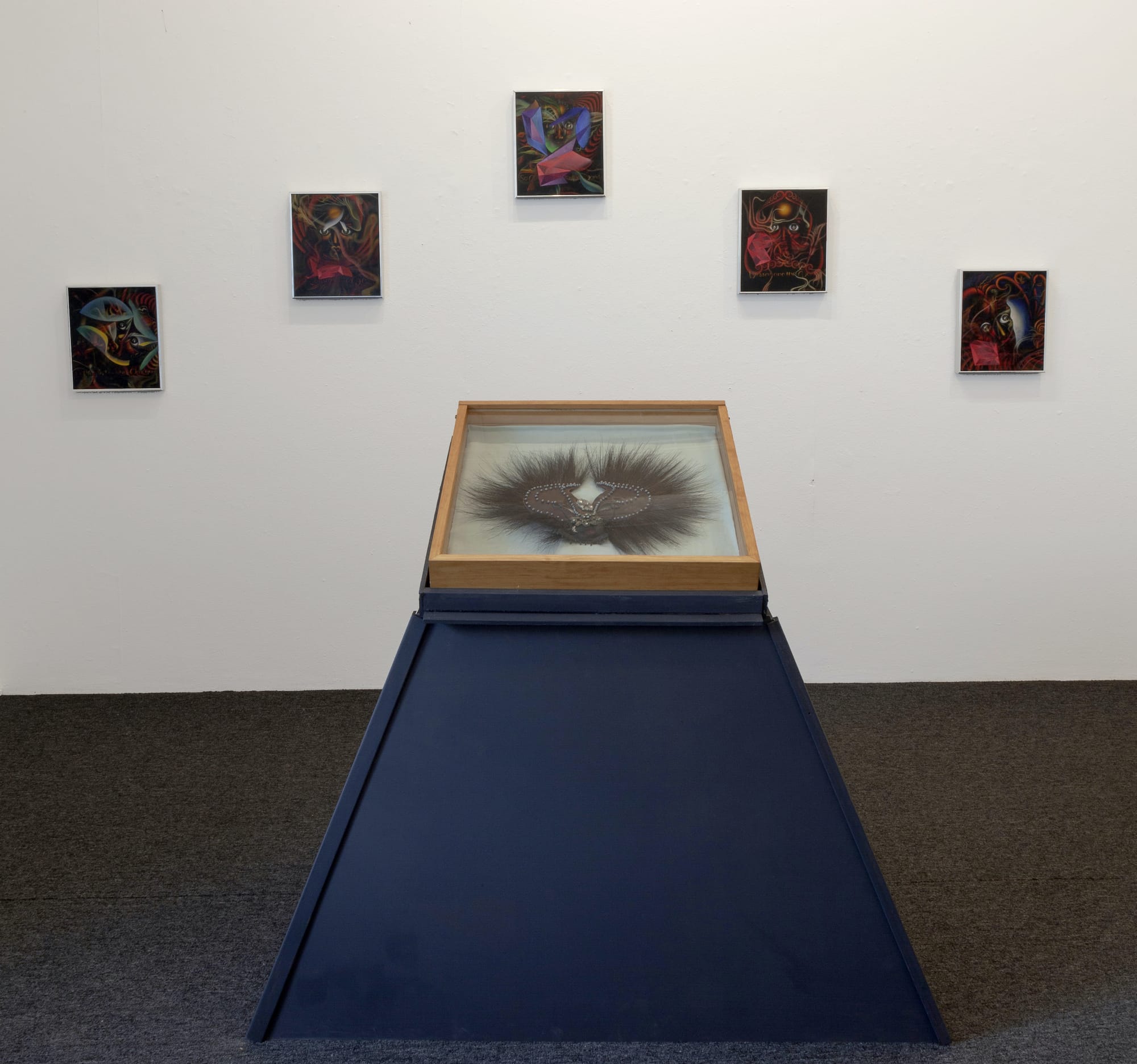 The works on paper continue up a stairwell to the second-floor gallery, where Peavy’s cosmology finds its strongest expression. Seven oil paintings line the walls, five installed in a pyramidal formation. Glass cases display elaborate, beaded masks that Peavy made and often wore while painting, in order to enter trance states and channel Lacamo; a photo shows her in an evening gown wearing one and holding two others.