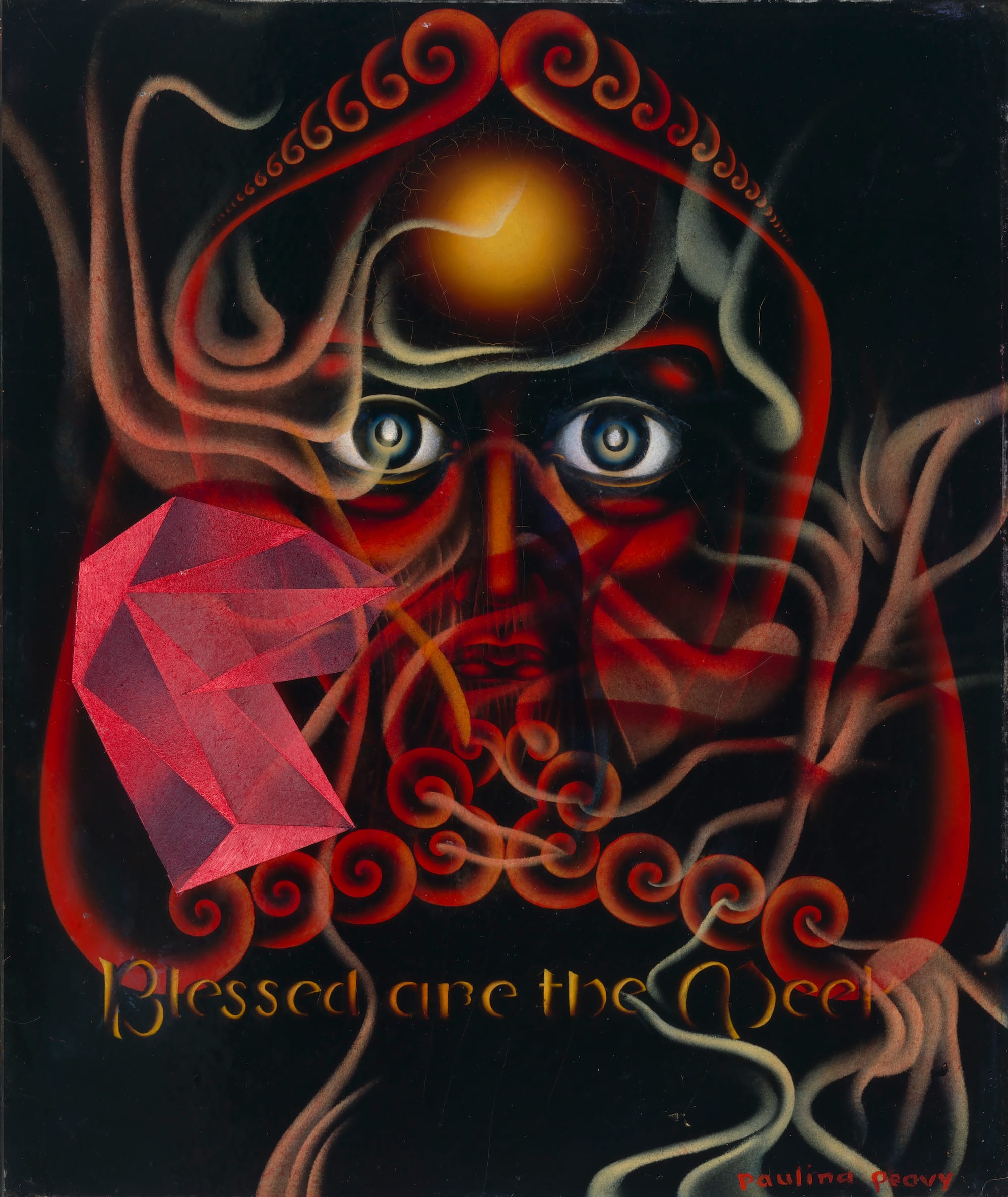 Singular and strange, the oils are less easily integrated into a modernist canon than the graphic abstractions on paper. In a 1981 documentary film that Peavy made about her work, Paulina Artist-Philosopher: An Artist of Vision, a narrator states that Peavy sought “wisdom beyond our world.” The faces in these paintings suggest it lay just beyond their Delphic gaze.