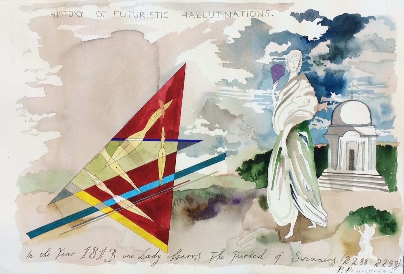In these works, the present moment remains altogether elusive, as the artist concludes in his exhibition’s text: “A suprema or a shell, floating up from the depths of an ocean, both can be a mode of transport allowing the past and the future to consort with one another behind the back of the present moment, which is all too bewitched with itself.” It is nowhere else but in the present that the hallucination of history is most visible, a rigid structure filled with inescapable “now-time” from which there is no flight. The utopian drive of these futuristic hallucinations is punctuated with a radical pessimism about our current condition, both social and political, so that the imagination of a distant future becomes a loud Messianic cry for salvation, in full awareness that none will come — the personages are only glancing into a speculative moment of possibility. Yet Pepperstein’s acute disenchantment with history is not flight — it is the writing of history itself.