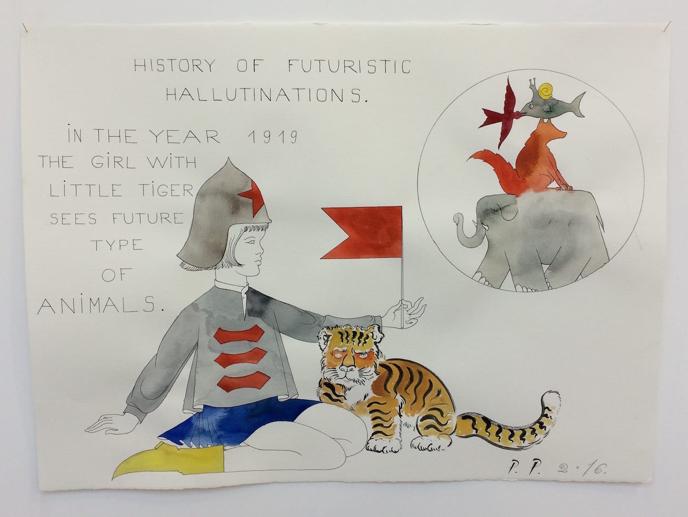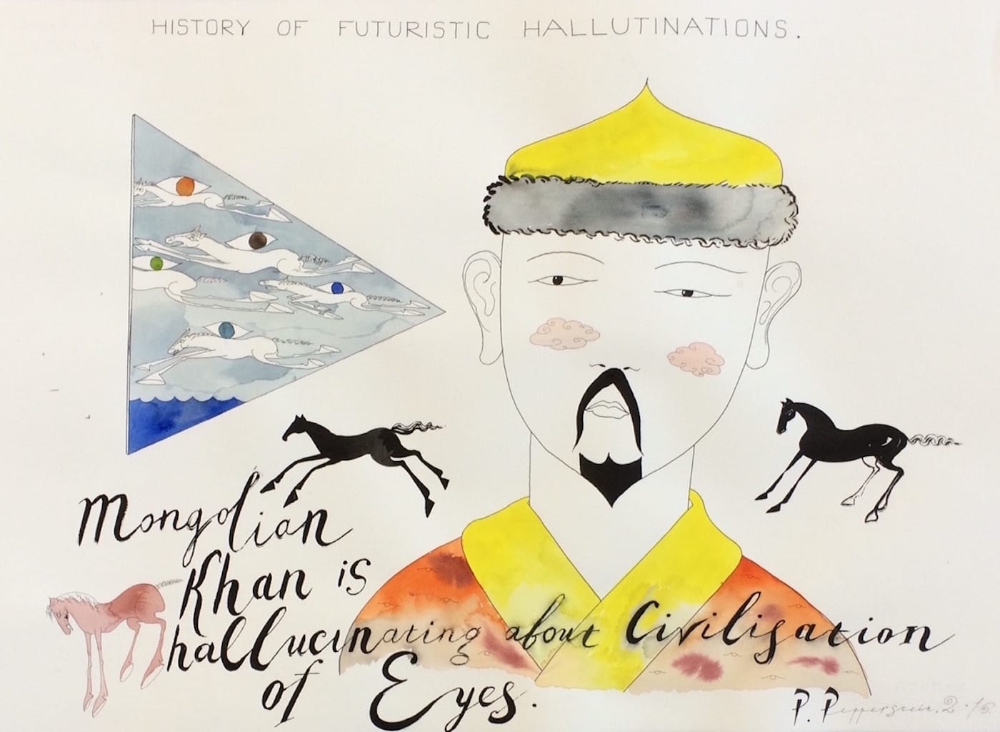 A History of Futuristic Hallucinations, which was on show at Milan’s Spazio 22 (in a collaboration with Moscow’s Iragui Gallery) earlier this year, presented some of the artist’s most recent work, articulating Pepperstein’s relationship to Cosmism, a potent cultural force among Russian artists in the 20th century. The Russian art critic Boris Groys devoted a whole series of texts to the subject, and Nikolai Fyodorov was among one of the earliest Russian Cosmists, a futurist Christian philosopher who theorized about the perfectibility of the human race through rather unusual means. In his view, humans (Russians in particular) would develop the technology to revive all people who had ever been alive, and therefore it would be necessary to colonize other planets in order to have somewhere to settle all these populations. In Pepperstein’s exhibition, comprising a single series of acrylic paintings and watercolors, the revived historical figures glance for a moment into their distant future.