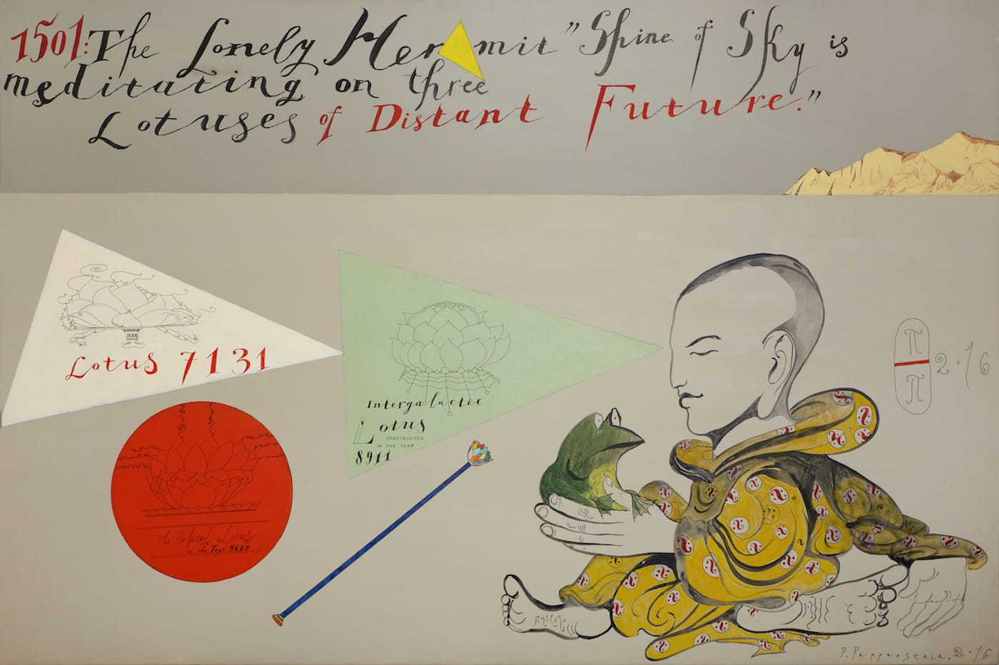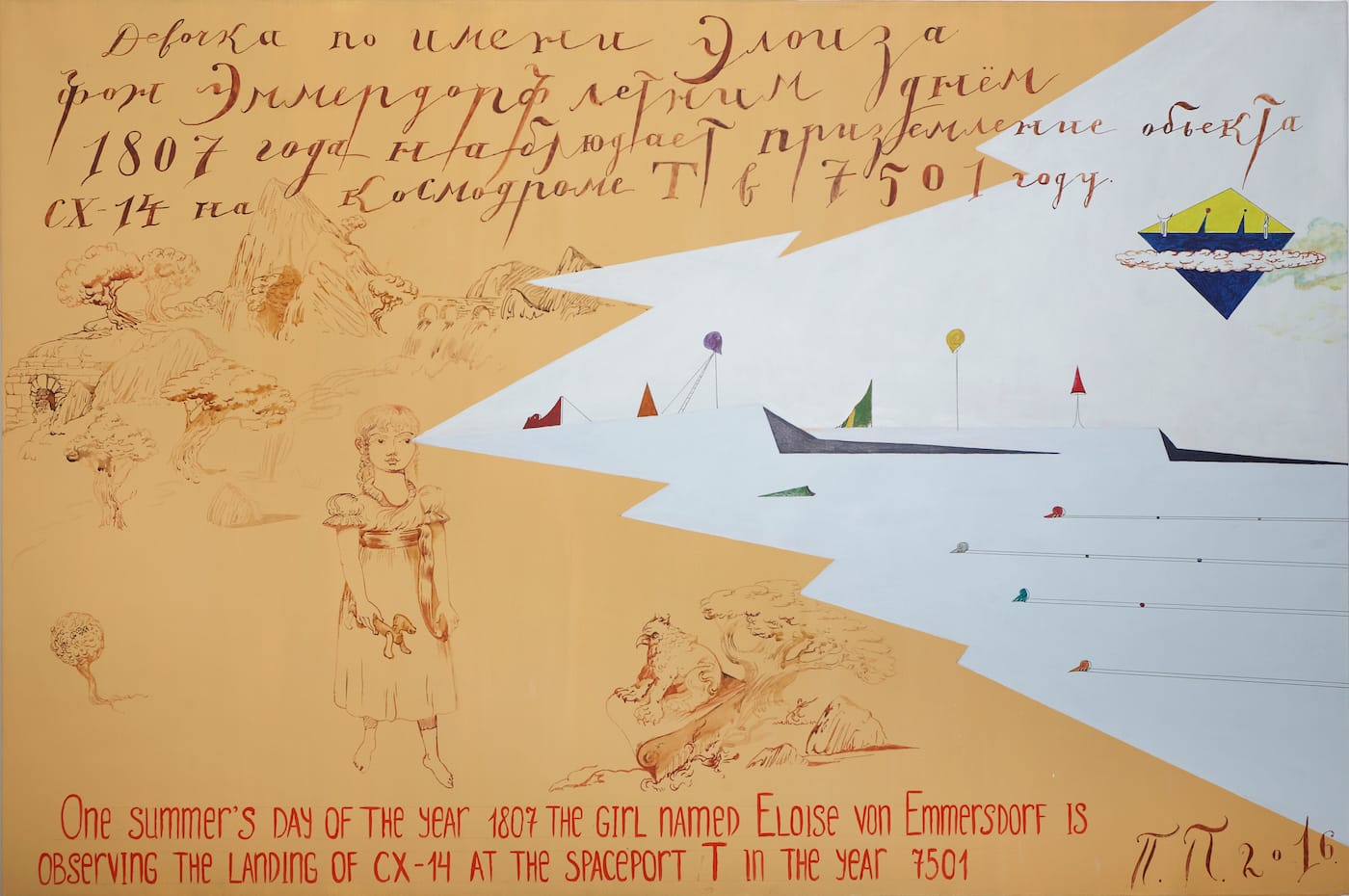 Pepperstein writes on one of the canvases, “Various personages from the past (Roman senators, frauleins, Indian and Buddhist ascetics, exalted ladies of the 19th century, British colonial generals, Russian Cosmists, prostitutes, monks, kings and the like) are captured in those thrilling moments in their lives when a vision of the distant future opens up before them.” You can read in the texts on the works — quintessential to Pepperstein’s work and to Russian conceptualism in general, so vastly grounded in literature — about Eloise von Emmersdorf in 1803, observing the landing of Cx-14 at the spaceport T in the year 7501, or a lonely hermit from 1501 meditating on lotus flowers from the years 7131, 8911 and 9600, or the Mongolian Khan (unspecified date) hallucinating about the civilization of eyes (located in Pepperstein’s writings, several thousand years after our own). It all begs the question: Is Pepperstein’s obsession with futures utopian or apocalyptic?