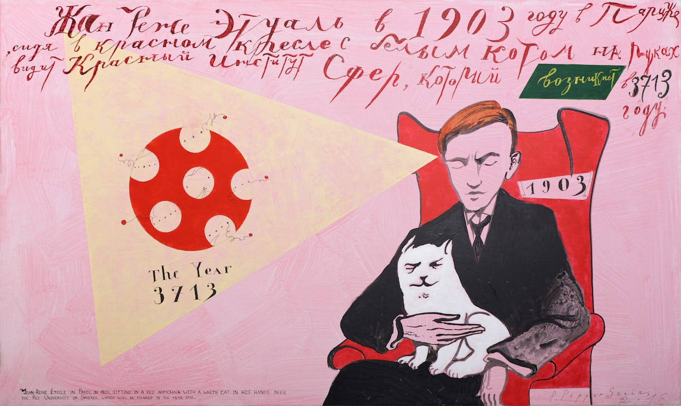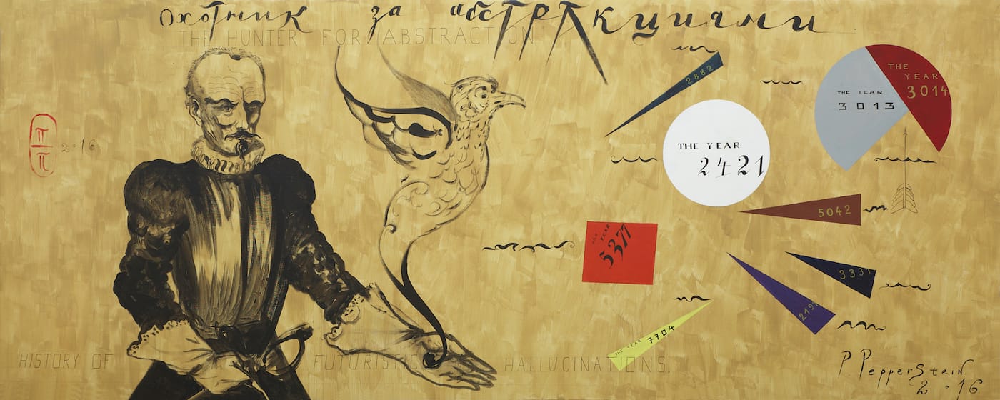 MILAN — To be familiar with the work of Pavel Pepperstein means to inhabit a twofold concept of history: Events are seen as occurring simultaneously in the past and the future, as both tenses gaze into each other from across the cosmic table, wondering about the significance of temporal distance and the numbers that bear it like a metal conductor carrying heat in opposite directions. What is more difficult to capture, more difficult than the cosmic and remote, is the moment of the here and now. One of Russia’s leading contemporary artists — the word “painter” seems inappropriate for a conceptualist and a decades-long cultural icon — Pepperstein lives out of an obsession with history, or with the possibility that history (especially one like the history of the former Soviet Union once and the Russian Federation now) and destiny are not identical, so that people are agents capable of imagining a different future, time, world — yet this imagination is their only agency.