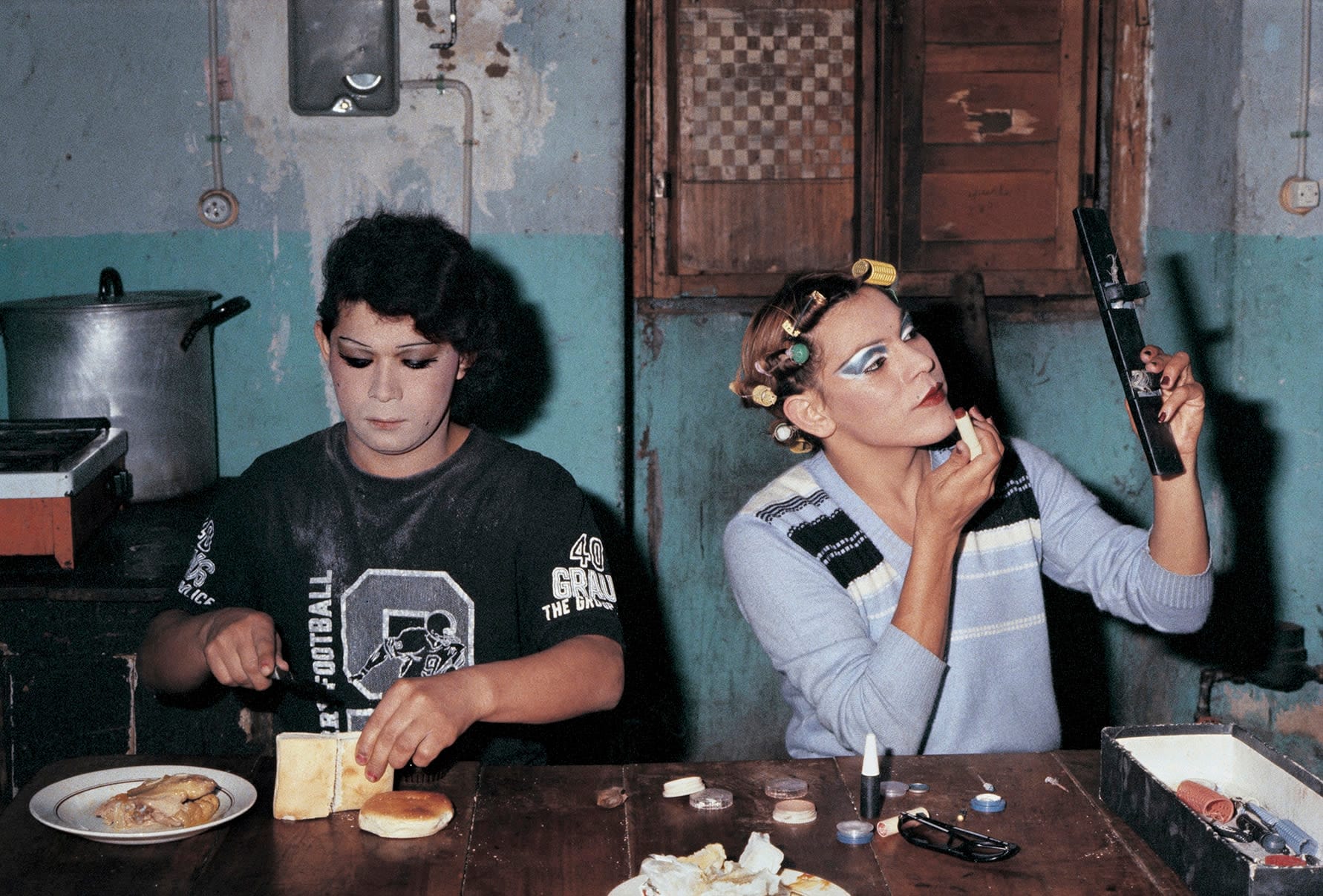 Errázuriz and Donoso became close with their subjects, even living with them. The closeness shows in photographs marked by intimacy and trust. Errázuriz's camera captures the quotidian lives of sex workers as they snack on grapes, fix their makeup, pose in front of mirrors, take to the dance floor, relax on beds, and hang out with their moms. (She dedicated the photo book to Mercedes, the very present mother of two of Errázuriz’s prime subjects, siblings Evelyn and Pilar.) Sadly, many of the vibrant individuals depicted in the "Adam’s Apple" series died as a result of AIDS-related complications or the extreme violence of Pinochet’s regime, which targeted their communities.