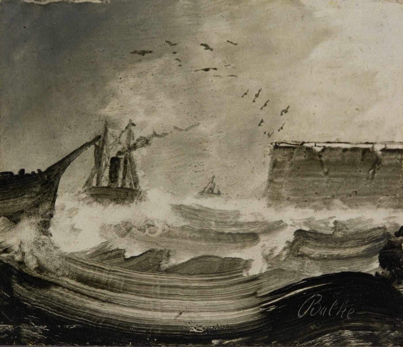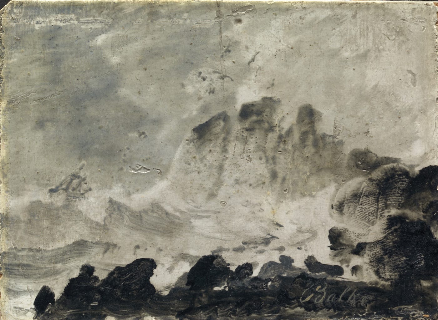 Along with his exploration of paint’s material possibilities, Balke used other striking devices: working with a near-monochrome palette in “Sea Fortress” (1844), or using his fingerprints to evoke the rocks in the foreground of the black-and-gray “Ships in a Storm” (circa: 1870s). In this grisaille painting, which is largely made of neutral grays and measures around three by five inches (the size of note card), Balke does not apply paint so much as wipe away areas of thinned washes, achieving effects we might associate with film emulsion. The interplay between the directional brushstrokes (waves), storm clouds (tonal washes), and stones (black fingerprints) is unique in 19th-century painting.