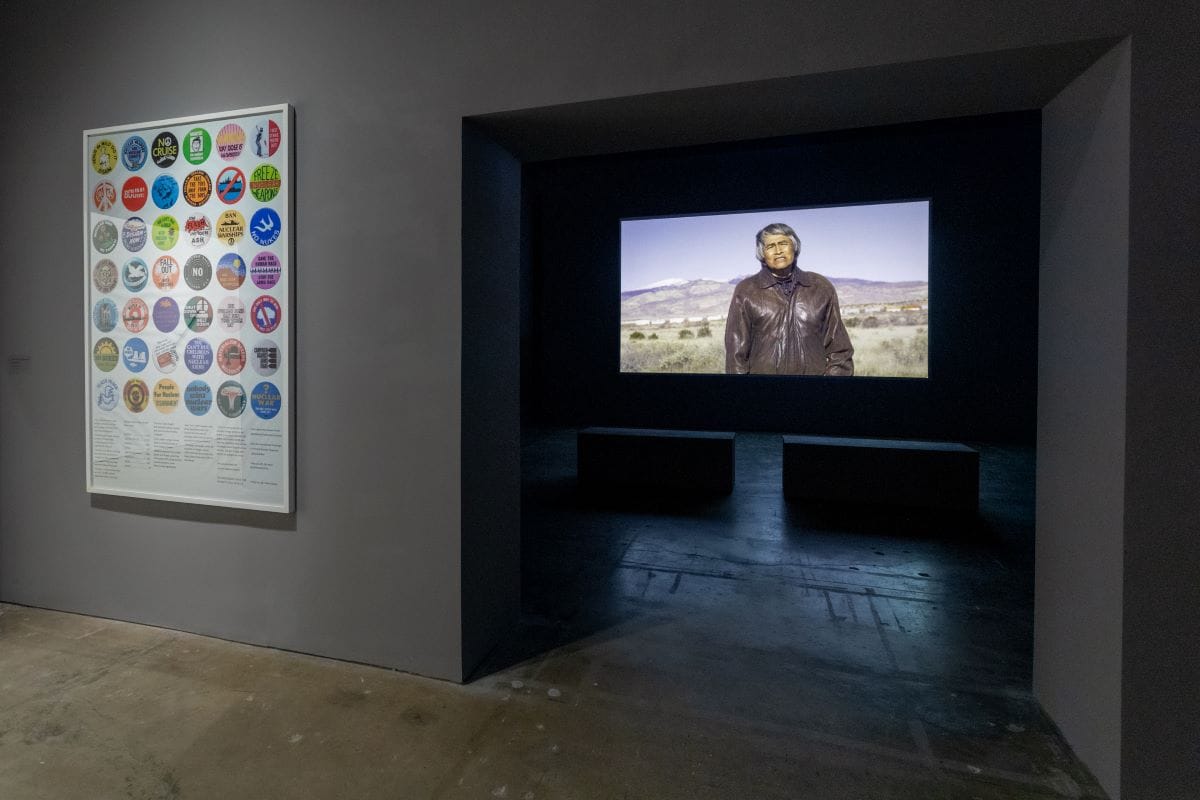 Perhaps the most pressing issue that Reyes puts forward is seen in “Under the Cloud” (2023), the short documentary that SITE Santa Fe commissioned. In the film, he shifts the focus to a different kind of disarmament: nuclear weapons, which have had a death grip on the New Mexican community for many years. The piece, which comprises found material and the experiences of Native American leaders and activists Petuuche Gilbert, Leona Morgan, and Larry King, offers an alarming view into the reality of uranium mining and nuclear waste and their harmful implications to the Native community in the state. Through historical facts, undamped activism, and a strong demand for environmental justice, the narrators make a clear and straightforward argument against the country’s misleading campaign of nuclear energy as a safe and clean alternative to coal and oil. Simultaneously, “Under the Cloud” offers a sinister parallel between the gun crisis seen in our communities and the use of nuclear weapons by the government. While we endlessly argue about the need for deadly weapons as means of individual and national liberty and protection, countless voiceless, innocent lives are lost in all stages of gun production, distribution, and use.