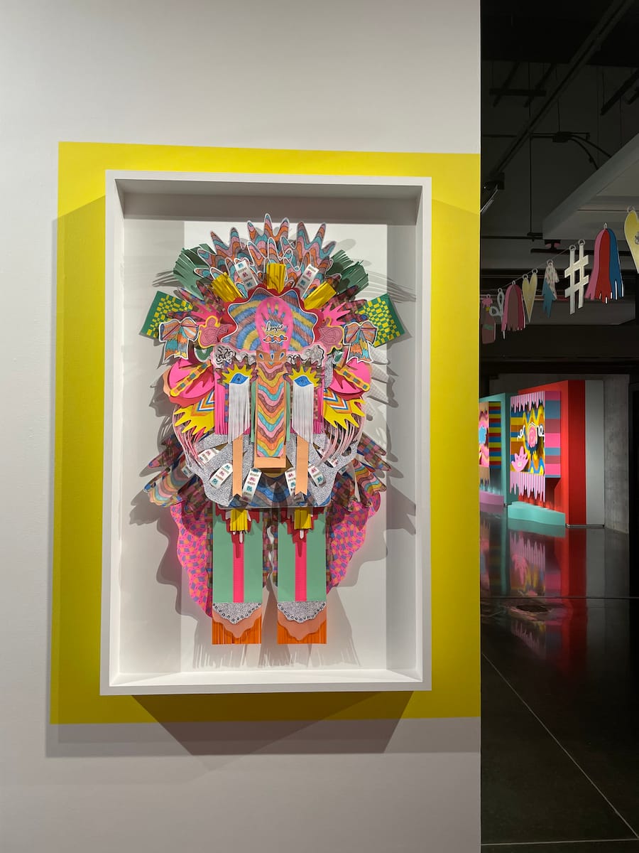 Important clues to the lineage of installation art in which Alpert lands are everywhere in Sticker Book. The outlines of fringed paper collages evoke generic, clip-art style renderings of Totem pole masks so directly, I immediately Googled the relationship of Lisa Frank to Native American art traditions as soon as I got to my car. Surely I would be the last to know of some obvious connection. It turns out Frank bought handmade pottery and jewelry from Native American artists, marked up the prices, and sold it on break from the University of Arizona during a formative time, she told Foundations magazine in a rare 2015 interview, which was reprinted by Refinery29.