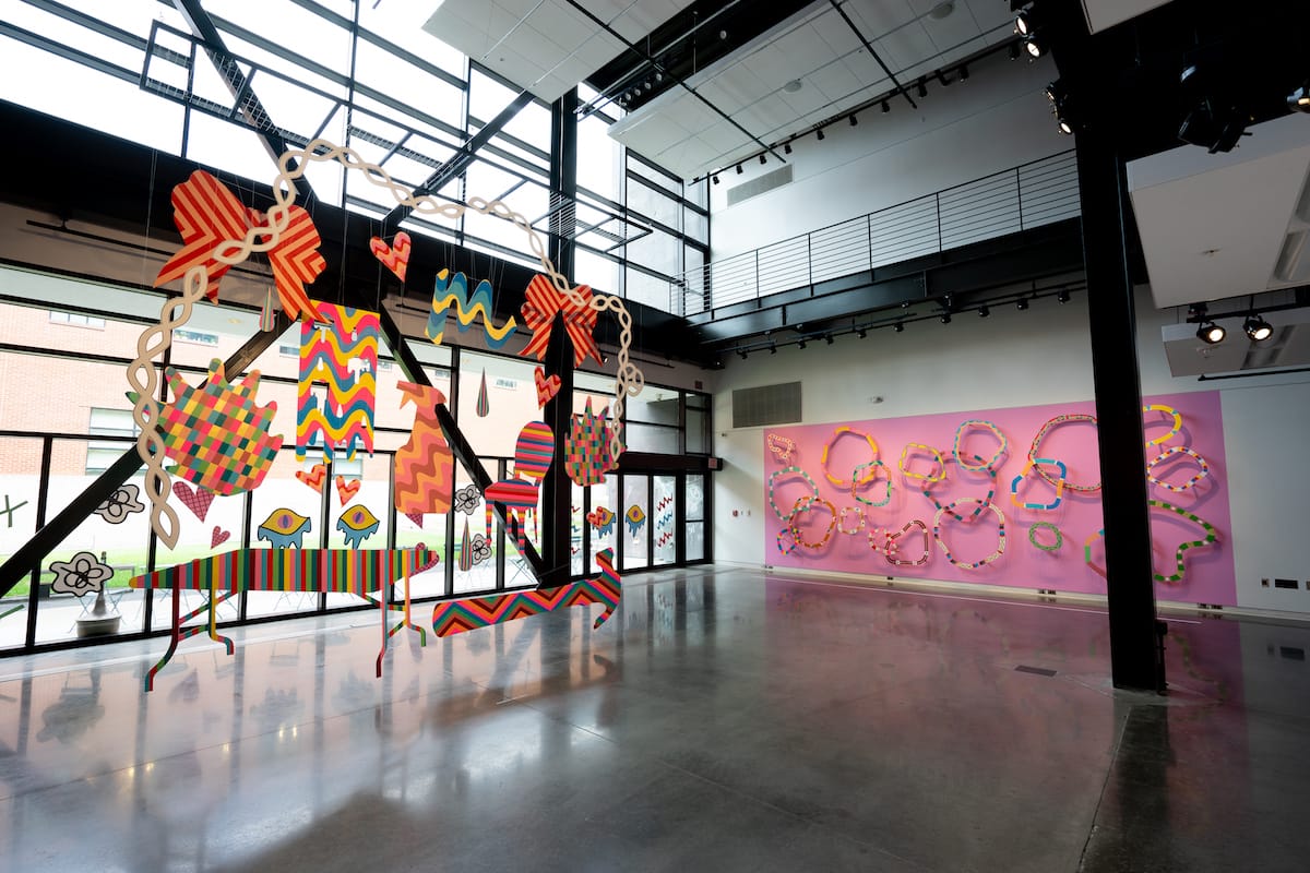 Flat, cookie-cutter shapes and effusive patterns represent what the artist describes as “universal themes of the human experience like her 1980s suburban girlhood.” This assumption of a common design language of comfort beyond her Maryland upbringing seems to acknowledge commercial trends at the time, the most ubiquitous being the Lisa Frank empire of school supplies and sticker books. But Alpert doesn’t allude to this beyond the premise, favoring instead an anonymous playground largesse no longer surprising to gallery goers in an age of immersive installation art. The artist seems nostalgic for broad strokes even as she uses them to decorate the 4,000-square-foot space of Ahha’s main gallery.