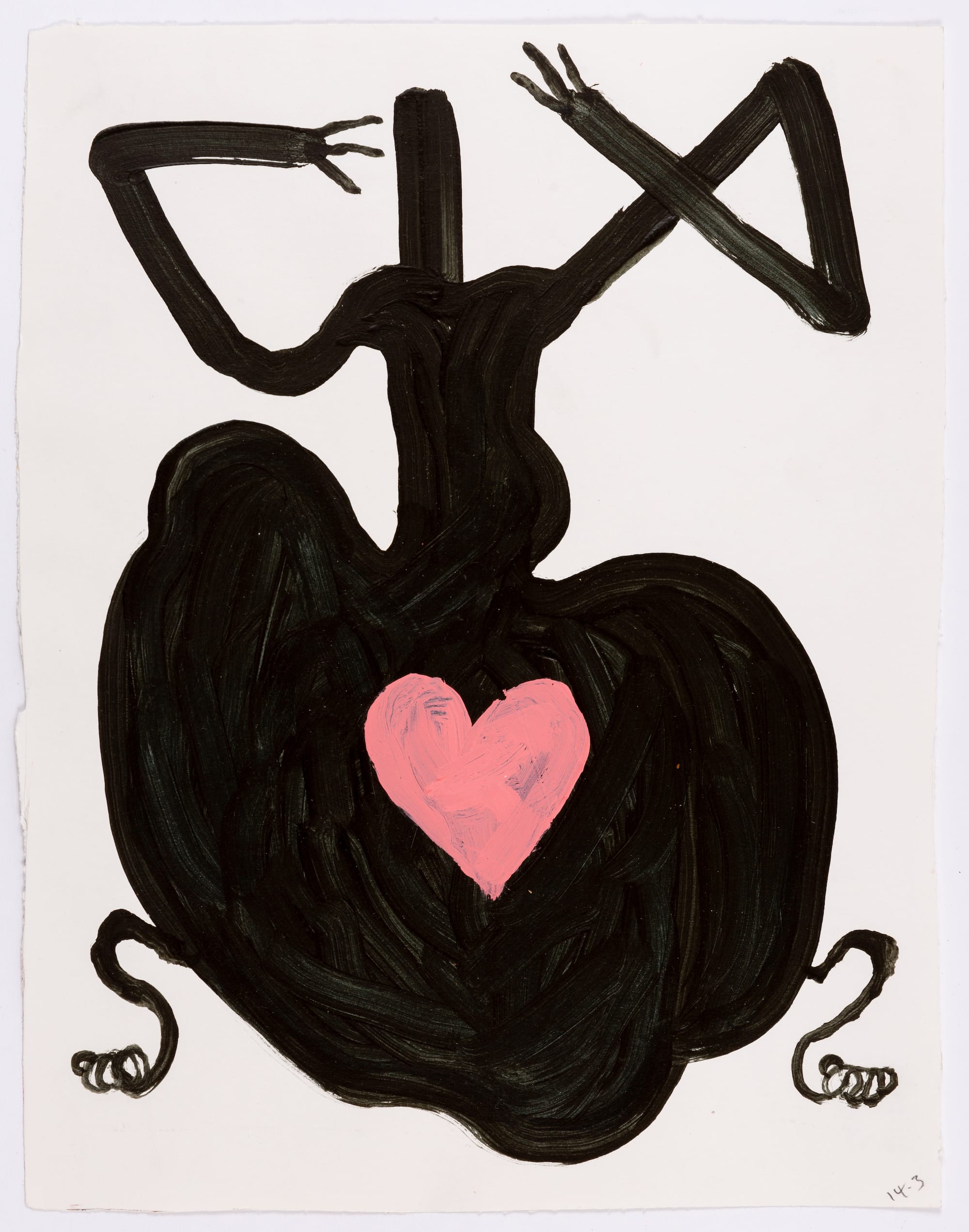 This idea of imperfection is integral to Goring’s representations of the body, whether through sculptures that announce these imperfections, such as “Wrong Doll” (2022) (an inflatable doll with WRONG FACE, WRONG HEART, WRONG FEELING, WRONG LEG written across its body and face) or drawings like the mutilated body of “Amelia.” These bodies, often flawed and unsettling, become repositories for feelings that are hard to contain physically. In the Extreme Naked Yoga Series, Goring takes the idea of yoga as a means to achieve tranquility and violently subverts it by evoking emotions that normally lie beneath the surface — suppressed by a meditative mantra — through tropes of body horror. "Extreme Naked Yoga 3” (2017), which portrays a nude figure with eyes open and mouth locked in a grimace, renders violent feelings corporeal as something strange and shapeless emerges between the figure's legs.