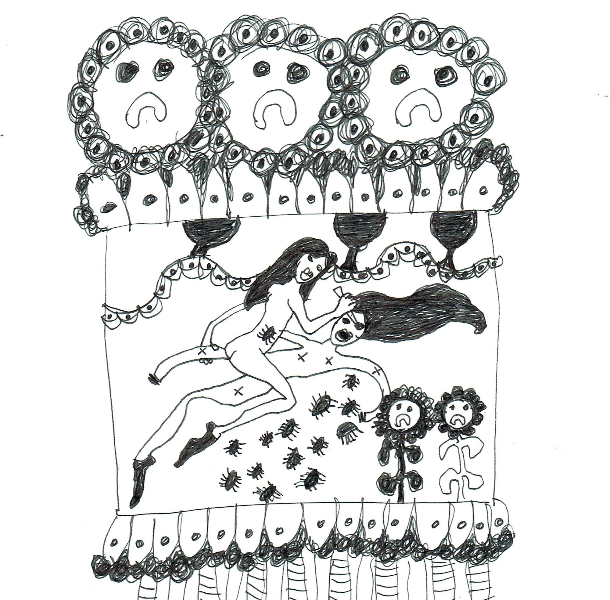 A sense of darkness lingers in a lot of Goring’s work, which straddles the line between personal and political: the materials that she uses, including ballpoint pens and free software (e.g., Microsoft Paint), are explicitly influenced by harsh economic realities. This reflects the uncertainty and anxiety that permeate her art: Me and mine (2017) is a series of what she calls “anxiety objects” — small plush faces with cartoonish features, like “CRY BABY,” who cries pink tears from black voids. These faces are recurring motifs in her work, as in “Blue Tree Grey" (2016) and “Pyre” (2016). With them, Goring creates a world of complex, often contradictory, emotions. In her art, she literally turns the self inside out to express feelings of fear or uncertainty as a deeply visceral extension of the body. “Amelia Dead Inside Me”(2017), for instance, shows a mauled body covered with hearts, bringing together love and violence, hope and despair.
