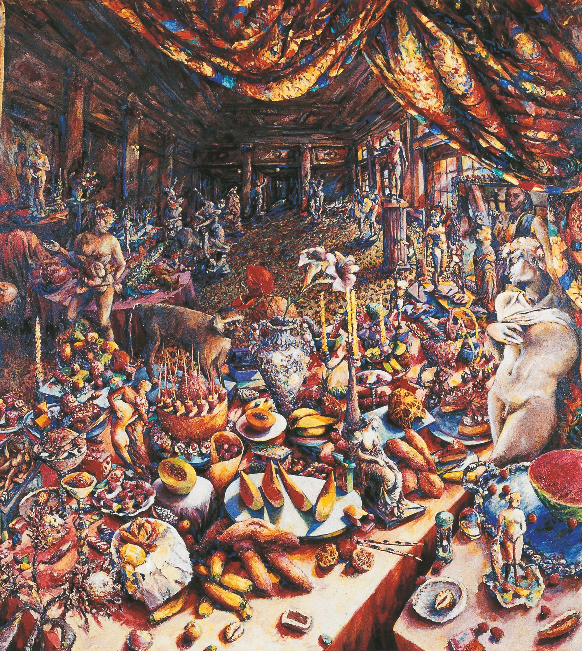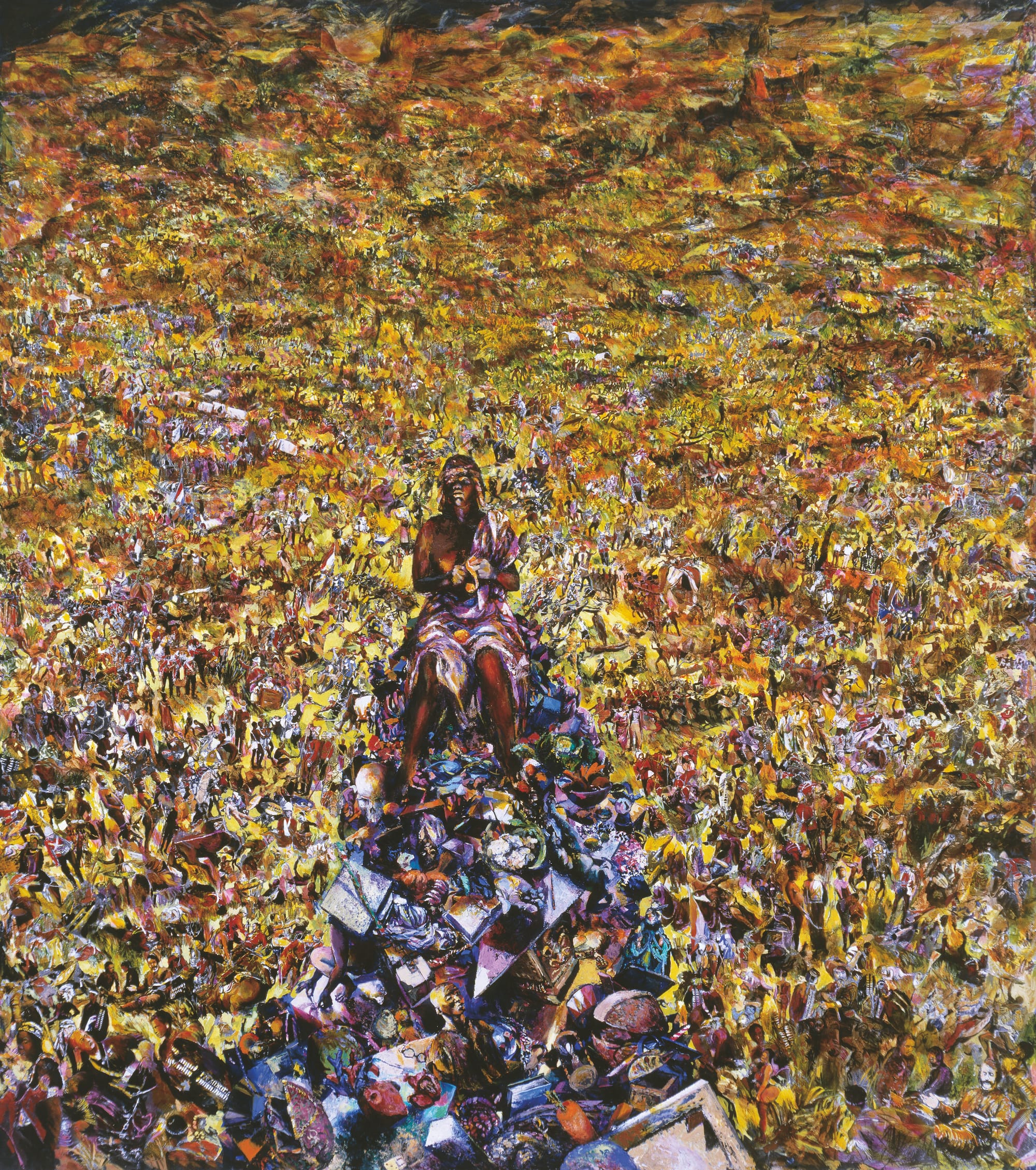 Very different in style are the History paintings (1985–95), whose baroque excess draws on European traditions of allegory. History painting, long considered the most elevated genre of classical European art, was originally unavailable to women, who were steered instead toward still life and domestic themes. “Melancholia” (1986) offers an ironic take on this legacy of exclusion by pairing classical sculpture with food and flowers: an orgy of consumption that doubles as a critique of Western ideological and extractive sprawl. Another important work, for its provocative medium and theme in 1980s apartheid South Africa, is “Patience on a Monument: ‘A History Painting’” (1988). Siopis combines a collage of racist images from school textbooks with a thick impasto, conveying in both form and matter the banal dissemination of colonial ideology as a catastrophe of meaning, edging out truth by filling the mental and pictorial horizon to the brim. A Black Patience figure seated at the center recalls cultural critic Walter Benjamin’s reading of Paul Klee’s "Angelus Novus": the angel of history whose face is turned toward the past experienced as an ever-mounting pile of ruins. She is quietly peeling a lemon. This generative intermingling of mundane and rarefied references is a signature of Siopis’s style and key to its layered signification.