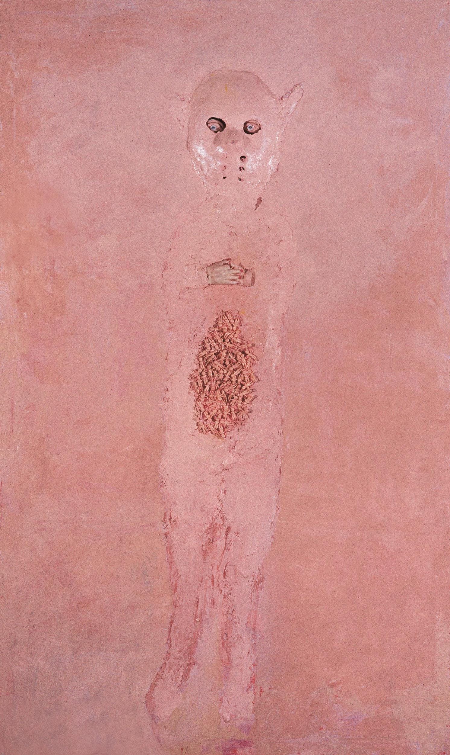 Siopis’s practice draws on many theoretical currents: feminism, anthropology, psychoanalysis, late 20th-century French philosophy. But concept is not allowed to dominate matter or empty it of its tactile, sensuous appeal and, often, horror. Her thick application of paint takes on the texture of food or skin in the Cake series; her melding of figure and ground unsettles the division between abstraction and figuration in the more recent Pinky Pinky series (2002–4). Pinky Pinky is an urban legend in South Africa that speaks to the uncanny cultural and sexual tangle of female adolescence: a half-human, half-animal creature that prowls on prepubescent girls in restrooms. Here, the artist plays with the limits of form at its most visceral, “dragging it to the verge of formlessness,” as she notes. Color and texture that trouble the boundary between skin and flesh, bodies both intact and flayed, or distilled into a single anatomical part with its appendages of teeth or nails, Pinky Pinky embodies materiality outstripping language to convey an unspeakable or nameless dread.