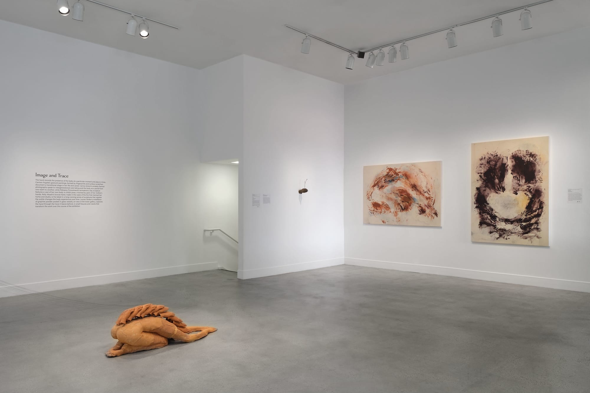 Mann’s video documents performances and activations involving a series of sculptural instruments the artist made from the cast of an arm, examples of which were also included in the show. These objects have a cupped hand with an opening on one end, like a megaphone, and a trumpet-like bell at the other end. Chronicling “ten years of collaboration, unruly sounds and collective listening,” as a title card states, most of the performances took place at art institutions. One performance shown in the video, however, was part of the 2017 May Day March in Los Angeles, during which participants used Mann’s horns to chant phrases like “No Justice, No Peace,” “Say it Loud, Say it Clear, Immigrants are Welcome Here,” and “No aceptaremos una América racista” (“We won’t accept a racist America”). Throughout the video, interstitial titles provide historical context, referencing the aftermath of the 2016 election, the overturning of Roe v. Wade, and the “summer of racial reckonings.”