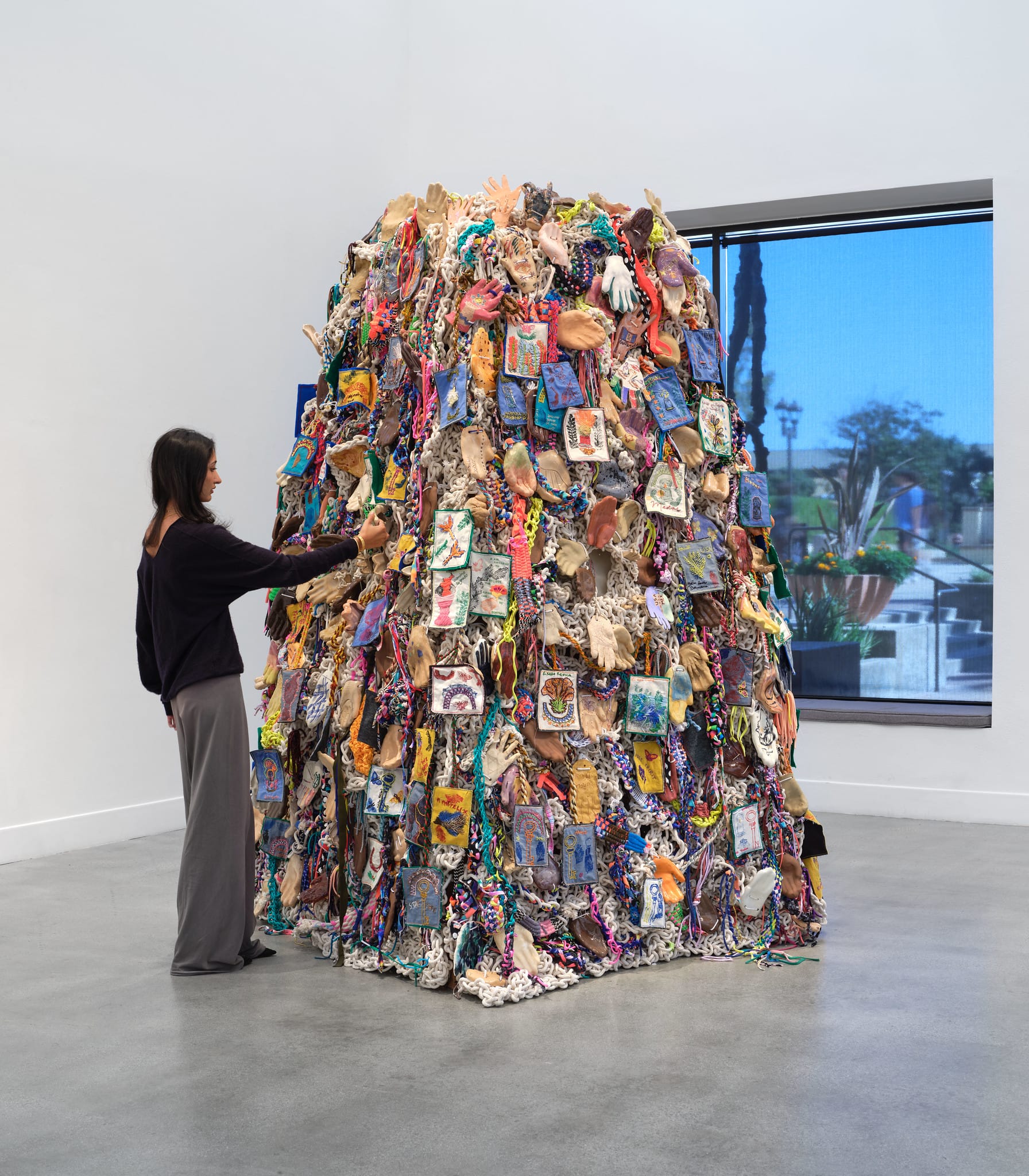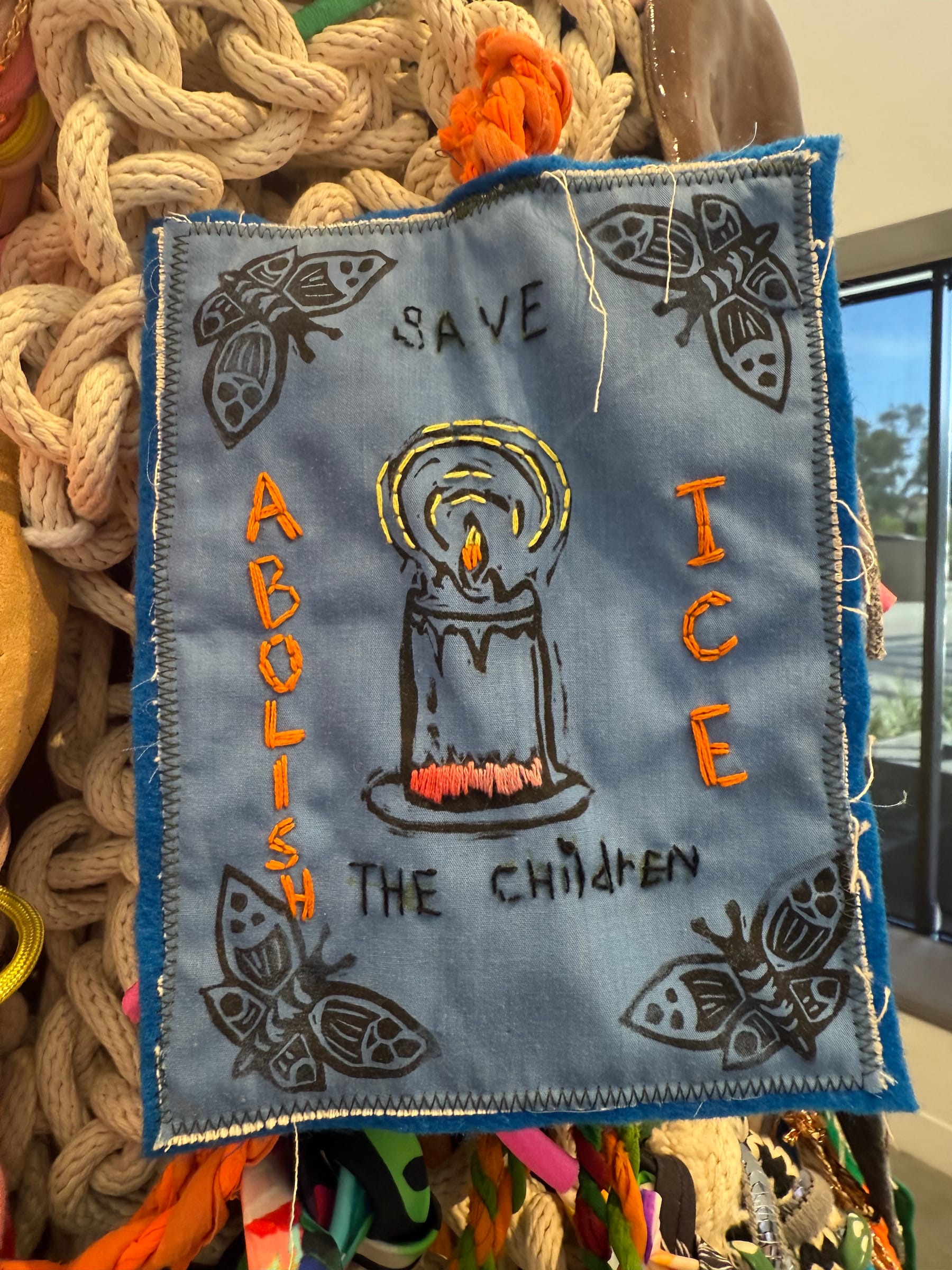 School administrators also took issue with an embroidery that read “Save the Children” and “Abolish ICE,” part of “Con Nuestros Manos Construimos Deidades (With Our Hands We Build Deities)” (2023), a large collaborative sculpture by the group Art Made Between Opposite Sides (AMBOS). According to Natalie Godinez, executive director of AMBOS, officials turned the fabric swatch so that the text was no longer visible and removed a sign informing visitors they could touch the artwork.