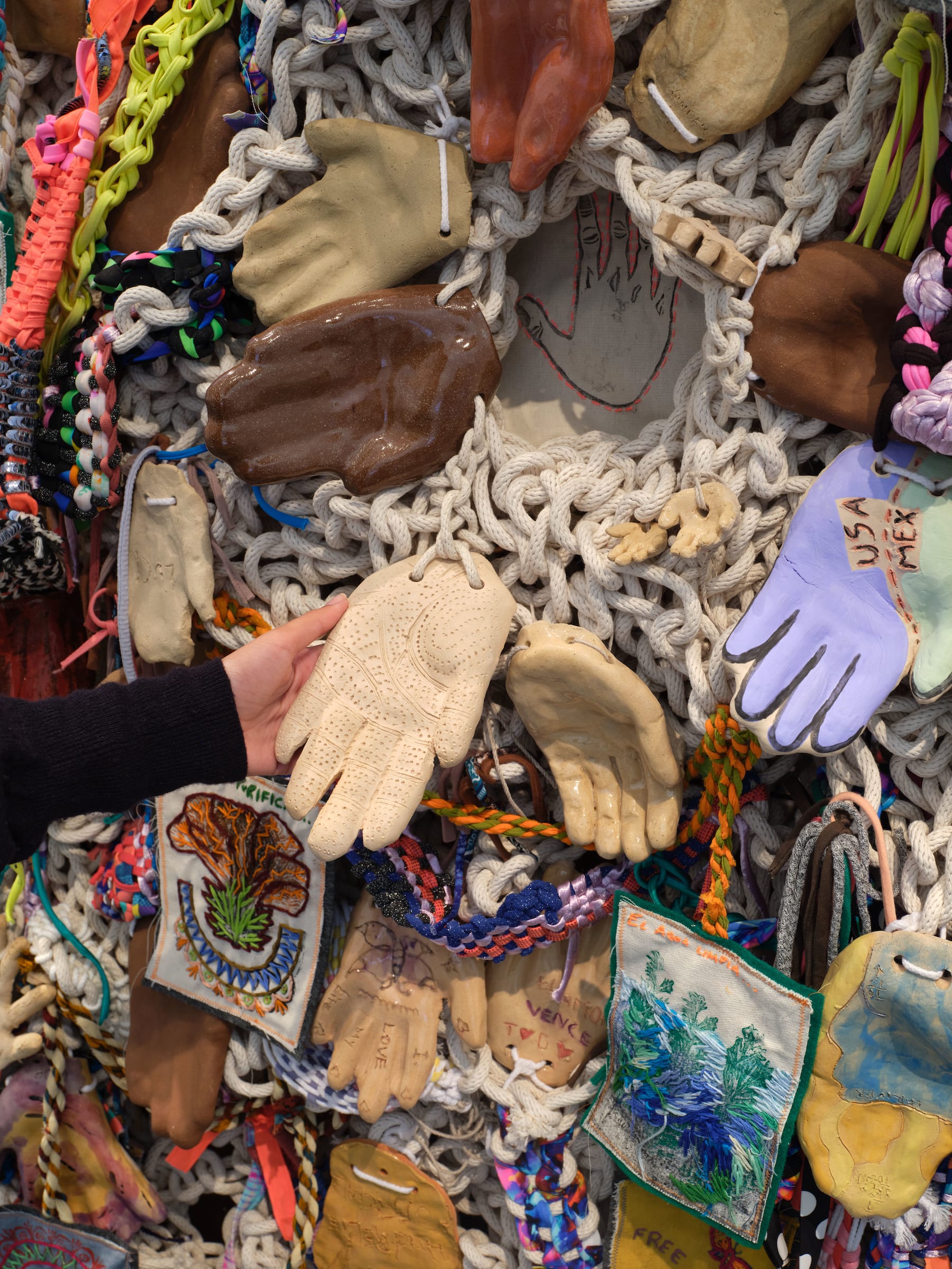 The work was the result of a series of workshops focused on issues of cross-border migration held by AMBOS in Tijuana, San Diego, and Los Angeles. Over 240 participants made casts of their hands and sewed patches with messages of protection resembling the devotional Christian garments known as scapulars.