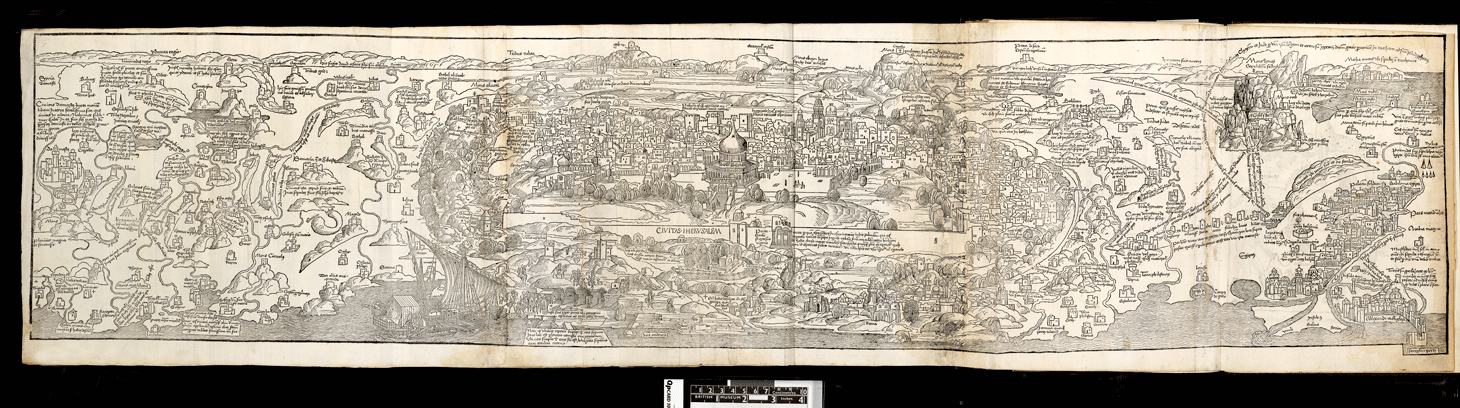 The 500-year-old book is composed of “pull-out” maps that fold out of the book. A detailed map of Jerusalem, still recognizable to the contemporary beholder, is believed to be the first-ever printed map of the city.