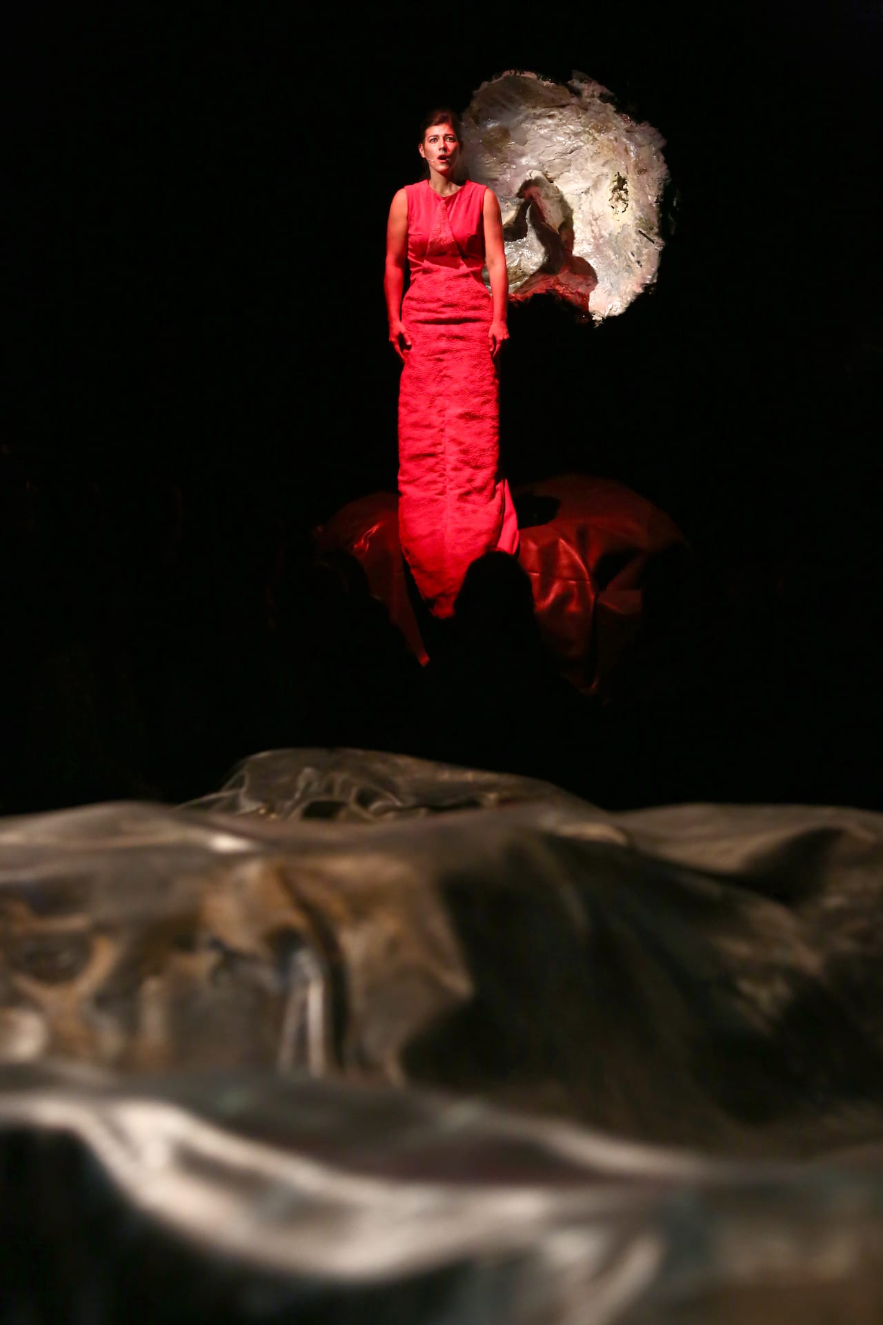 Pauline Curnier Jardin’s The Resurrection Plot is another commissioned work, performed in the cathedral-like long hall of Pioneer Works in Red Hook, which seems to speak of history and industrial grandeur so well that the space almost performs itself. The Resurrection Plot took place on a lumpy, plastic-covered field, brushed with dark colors in a kind of camouflage, placed in the middle of the hall, the audience seated in the round. At the start, the performers, wearing shiny black costumes with cone hats, tossed glassine envelopes full of mock drugs to audience members. What followed, however, most often felt like children’s theater, as the performers jumped up and down, or danced in a succession of costumes. Not suitable for children in one respect was the sequence in see-through latex fetish wear. Early on, a singer in a red velvet dress paraded through the hilly structure and mounted the stairs at the far end of the hall where she posed with a large seashell-like object. At times she seemed to be singing live and at others simply posing while the music was electronically reproduced.