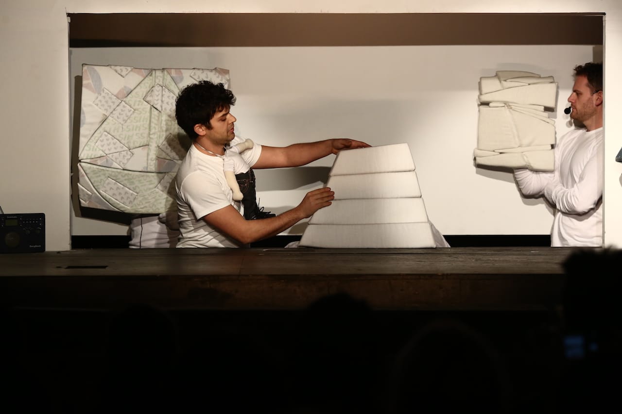 The artwork puppets are Robert Ryman-esque concoctions of foam wrapped in white fabric. Kahn uses two of the puppets to allude to the split between formalism and process in contemporary art. An incomplete artwork is the protagonist, its parts still vulnerable to disassembly at the artist’s whim. The debate over formalism and process is treated humorously, and here the talented puppeteers really put on a show, albeit one that would be more suitable to smart New York children in their first brush with high art. For adults, there wasn’t much to think about.