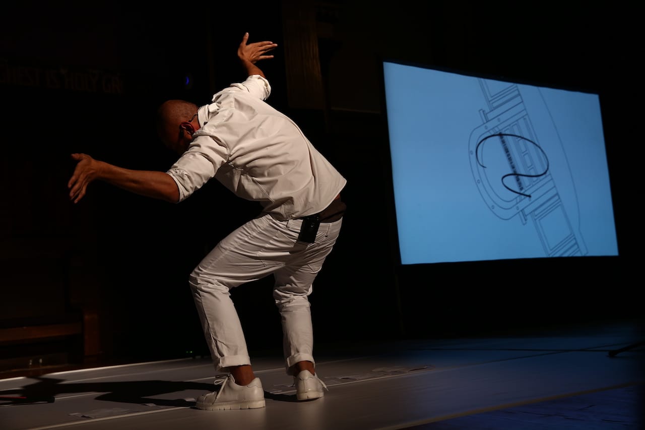 In any case, White’s music is extraordinary and well worth hearing, with or without a Plexiglas box; one can easily imagine him as part of a delectable jazz trio in an intimate subterranean club. I wish I could say I enjoyed Soares’ dancing equally. At least here, her range was limited. She tended to keep both feet planted on the ground, often gesturing with her palms curled into a cup and held upward. She and White had a nice rapport that was enjoyable to see. When she watched herself in the reflective Plexiglas, just as a dancer might do in a studio mirror, the surveillance aesthetic of the piece found its mark.