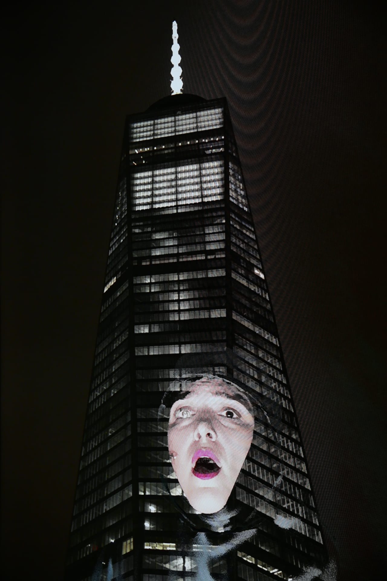 Unrewarding was Jesper Just’s in the shadow/ of a spectacle/ is the view of the crowd. Just was given the raw space on the top floor of 225 Liberty, which must have really lovely, sweeping views, not, however, to be seen on this visit. Instead three tiny portals were left on blackened windows along the show’s path. Apart from the blacked-out windows, Just installed a kind of fencing to herd us along a path marked by projections, video screens, a colorful, pseudo-sciency apparatus of tubes and lights, and a live video feed of One World Trade Center. . A slow bass line played on the sound system. Though the project was described as a symphony in four parts, the crowd rushed through to the end to discover a solitary inert singer whose cue would not arrive for a long time. People nonetheless took photos of her and posed for the video camera that would later be used for the singer’s overlay on the One World Trade Center live feed. Attendees queued up to peek out the portals, as if they were at a mountain overlook, pointing out their apartments and other developments and taking photos of themselves, ignoring Just’s installation, as it had little to offer.