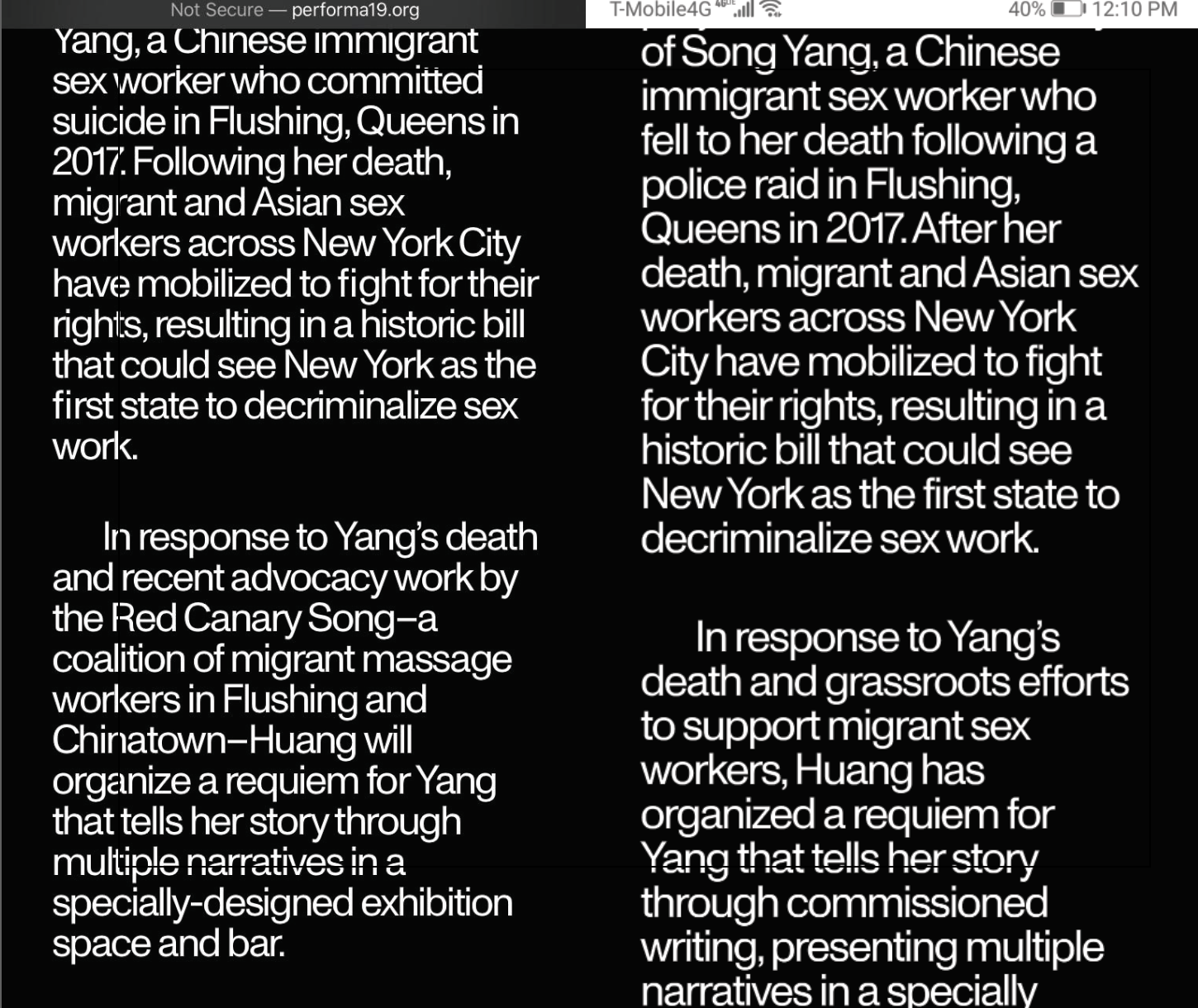 When RCS members first met with the artist and the Performa curators (five days before the exhibition opening), we asked Performa to shift the language in the event description, which presented Song Yang’s story as suicide, as opposed to a targeted attack to her physical and psychological safety by the NYPD. It became concerning to learn that the artist relied so heavily on the New York Times article, which obscures the criminalized and vulnerable conditions of migrant care laborers to tell a sensationalist sex worker story.
