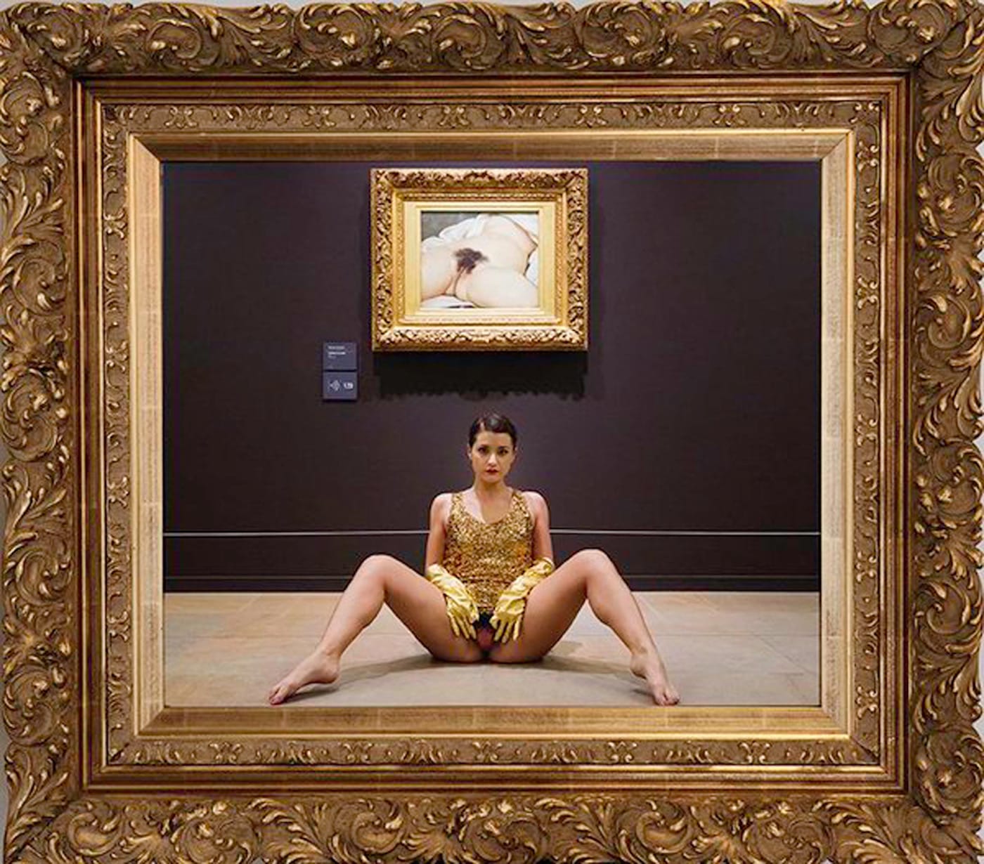 De Robertis’s “Ma chatte, mon copyright” performance also follows her pink masterpiece (so far): the conceptually focused feminist performance “Mirror of Origin” (2014) where she exposed her genitals seated on the floor in front of Gustave Courbet’s “L’Origine du monde” (The Origin of the World, 1866) at the Musée d’Orsay, mimicking the painting’s exposure of the genitals of a woman. She was arrested for that performance as well.