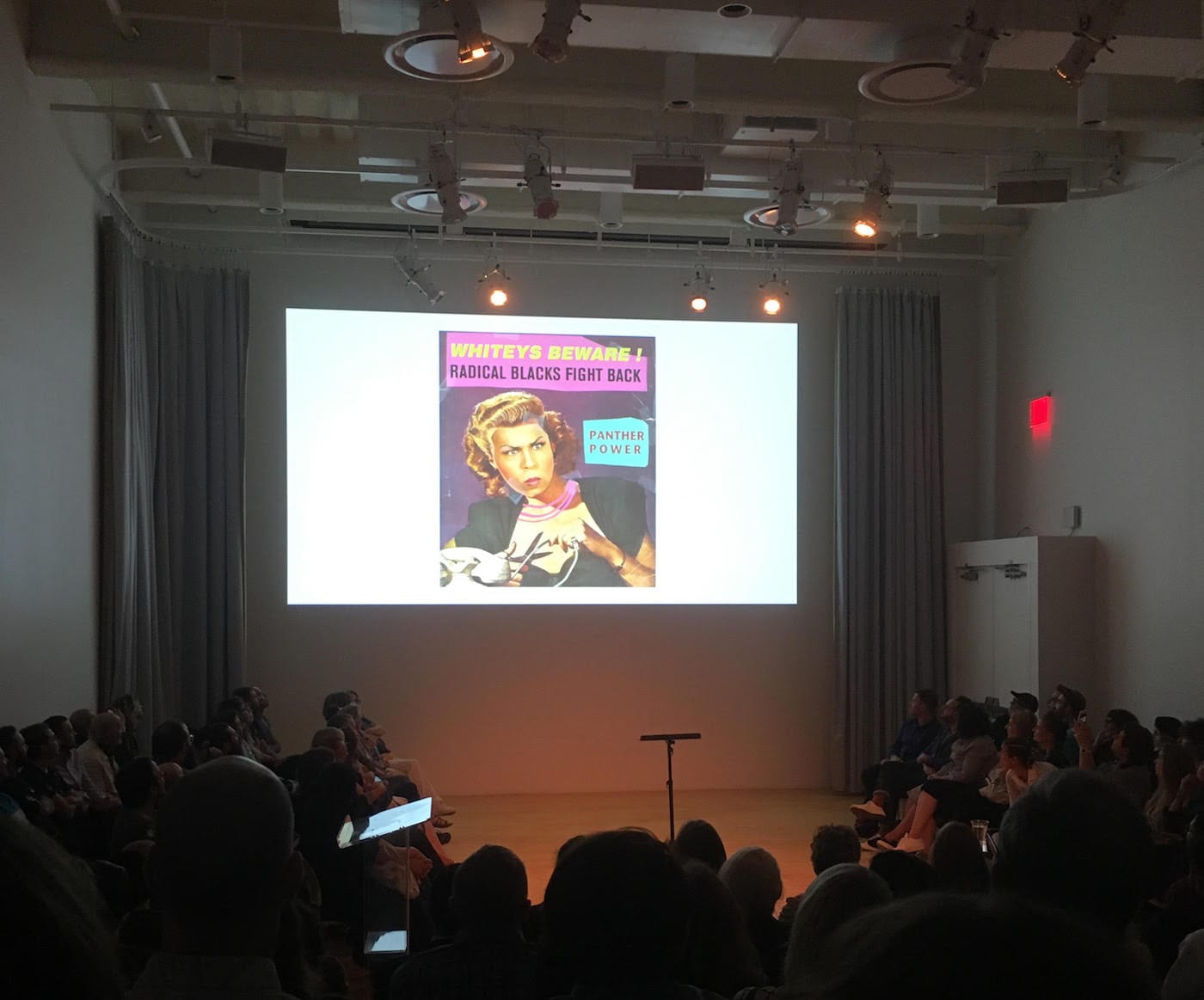 In the New Museum Theater, an image appeared on the screen: a cut-and-paste portrait of the artist Vaginal Davis over the face of a woman snapping a phone cord with the text above, “Whiteys Beware Radical Blacks Fight Back.” A phone call between Davis and an anonymous man whom she calls her “darling communism” played. “Unfortunately it is our burden to have to go over this again,” Vaginal Davis said in a high-pitched voice, referring to the subtle racism among the political left and the underrecognition of collective housework and chores.
