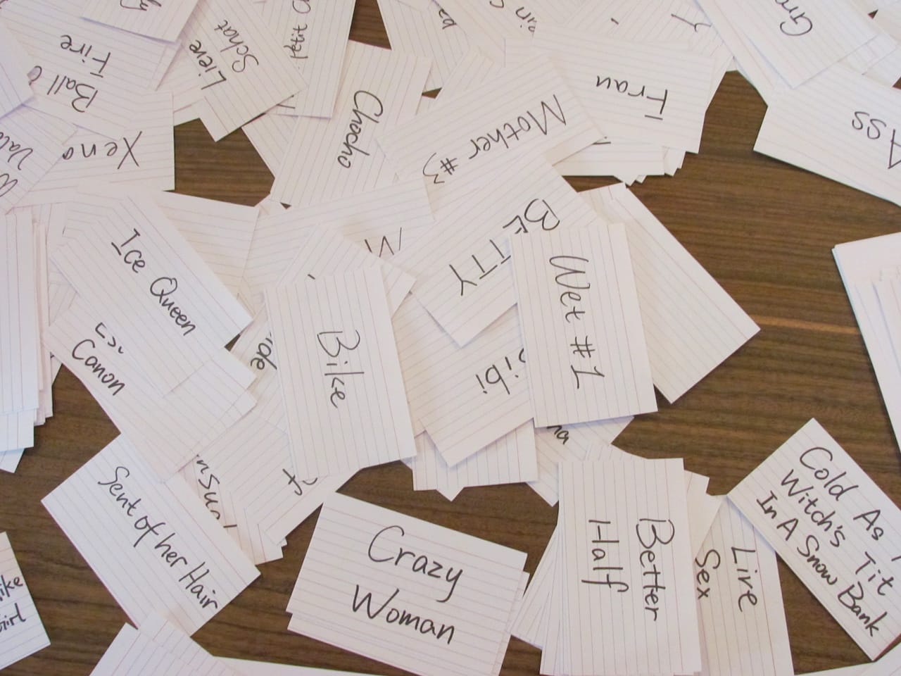 By far, the most arresting performers —artists, writers, arts professionals, and one self-described “dandy” — were those who appropriated the words in personal ways, whether sarcastically or earnestly. One woman labeled herself a “flirt,” slipping the elastic band from her hair, then a “ditz,” followed by casually unbuttoning her dress, and ended as a “dumb blonde,” swaying her hair in an exaggerated manner. Another woman inserted “I” before each phrase: “I’m a widow”; “I’m beautiful”; “I’m always faking it.” A man chose words that reminded him of his first girlfriend, Nancy, such as, “soft,” “smart,” “assertive angel,” “slut #1,” and concluded with, “she is a dream. I change my mind”; whereas a woman selected terms that her ex-boyfriend used to say to her, mainly “bitch,” “bitch,” and “bitch,” occasionally peppered with something like, “ravishing.” One woman, after uttering “douchebag,” added, “somebody called me that last week.” Audience members, myself included, almost always responded by laughing, whether from genuine amusement or discomfort wasn’t exactly clear.