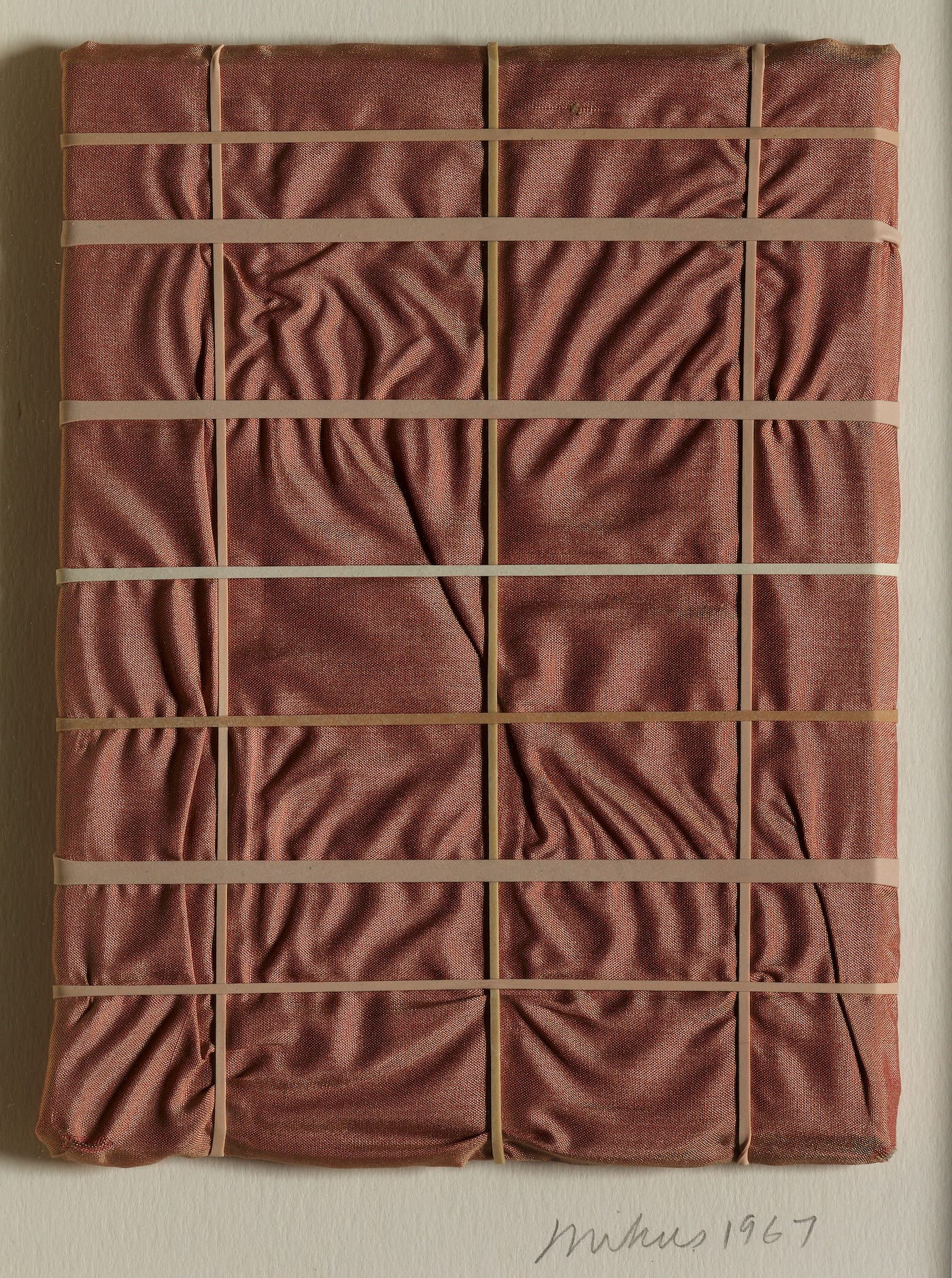 In a small, intriguing piece, “Untitled (1967), she wrapped a rectangular board with rose-colored cloth and then wrapped them both with an uneven grid of vertical and horizontal rubber bands. It is the surface we are supposed to look at, even as we know there is something hidden or, perhaps more accurately, unseen.