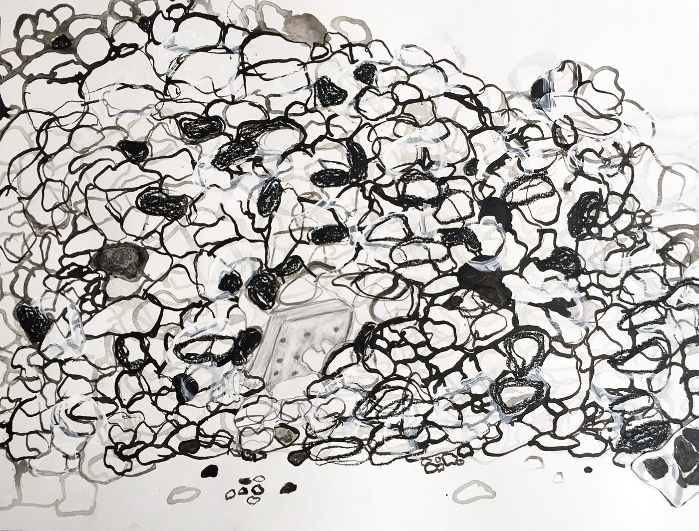 This drawing is inspired by an image published by the UN documenting the demolition of Palestinian homes on the Palestinian West Bank and in East Jerusalem. Seventy-seven people were left homeless. The presence of a mattress amongst the debris reminded me of Riverbend’s narrative and the trauma of coping with displacement.