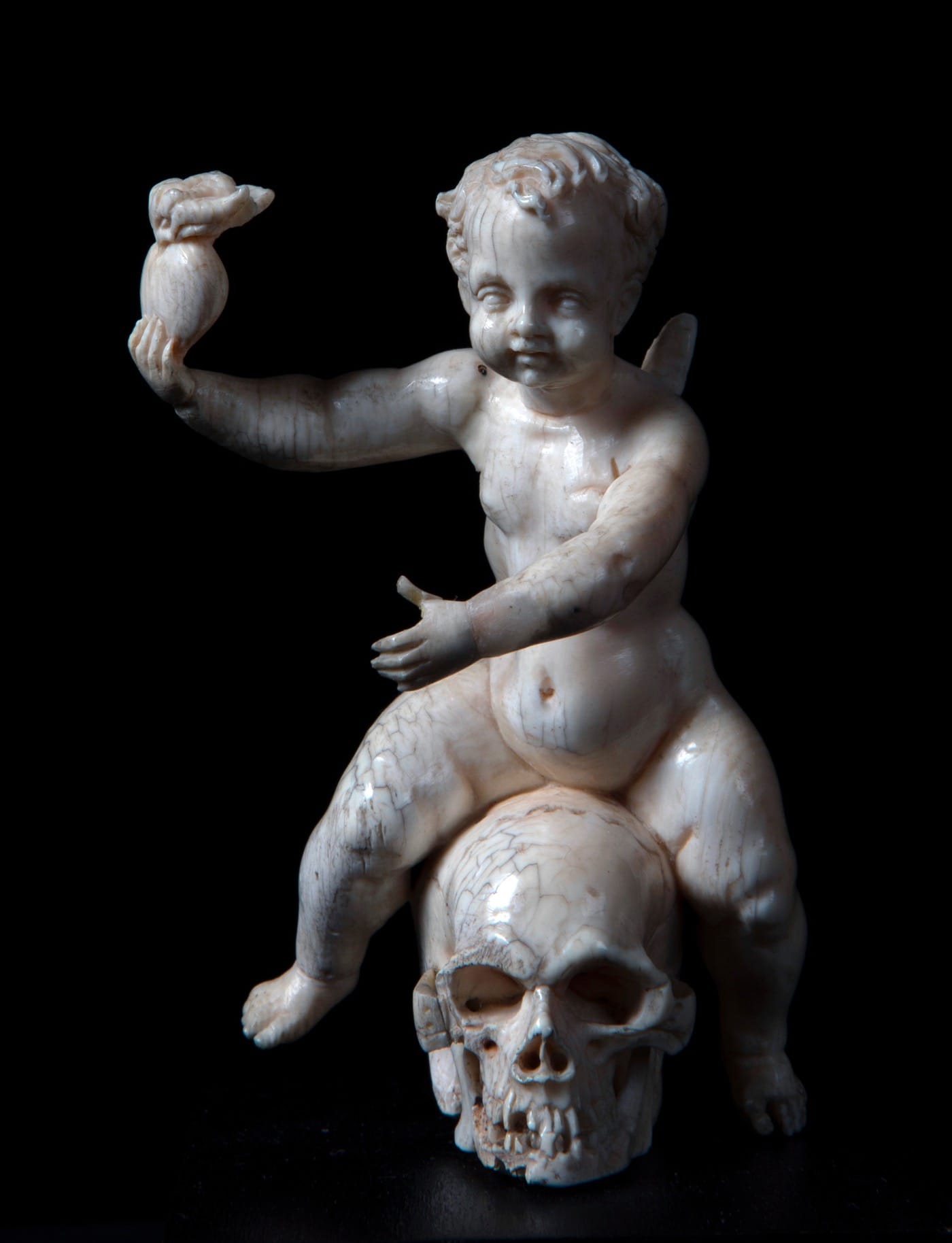 Flower-like, nihilistic death and sex imagery is also bound together in “Skeleton Seated on Skull” (19th century), a very delicately carved Okimono ivory sculpture from Japan. It’s fine craftsmanship cranks up the grand themes of life and death and soul in a way I see culminating in a double game of celebrating and mocking death. Holding a long, phallic-shaped instrument, the skeleton is either enjoying the superior position of riding-high on this skull, or possibly fucking it. When I write “soul” here, I am thinking of soul as in soul music: the mixing of sex and love with tragedy.