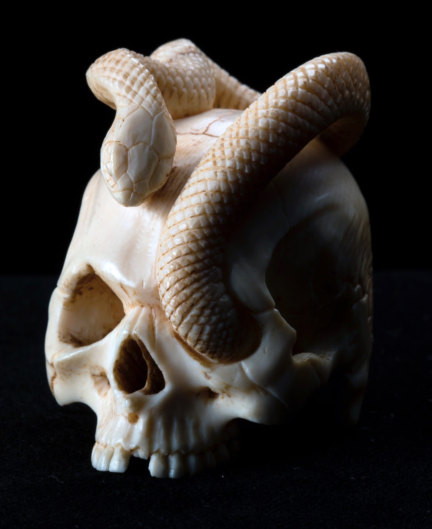All art is a contribution to creative communications, so even gnarly death images are never but pretend destruction. In Not Even Afraid a morbid consciousness moves in and through and around these delightful carvings — in some cases changing my emotions from pity to folly in the same piece, and that flip of feeling ultimately projects life-affirming energies. For example, plenum and the vacuum meet and intermingle in another Okimono carving, “Skull and Serpent” (19th century). This freakish and sexily opulent piece of skull fuckery vibrates with virtuosity, projecting a mesmeric unease that plunges far below its material circumference. A long, thick, writhing, phallic snake has slithered out of the left eye socket and worked its way to the skull’s summit. Thus male virility is acclaimed, but also plagued with anxiety. Staring at it can make one feel a bit queasy: engulfed and saturated by its ill-omened, lapidary stylish significance.