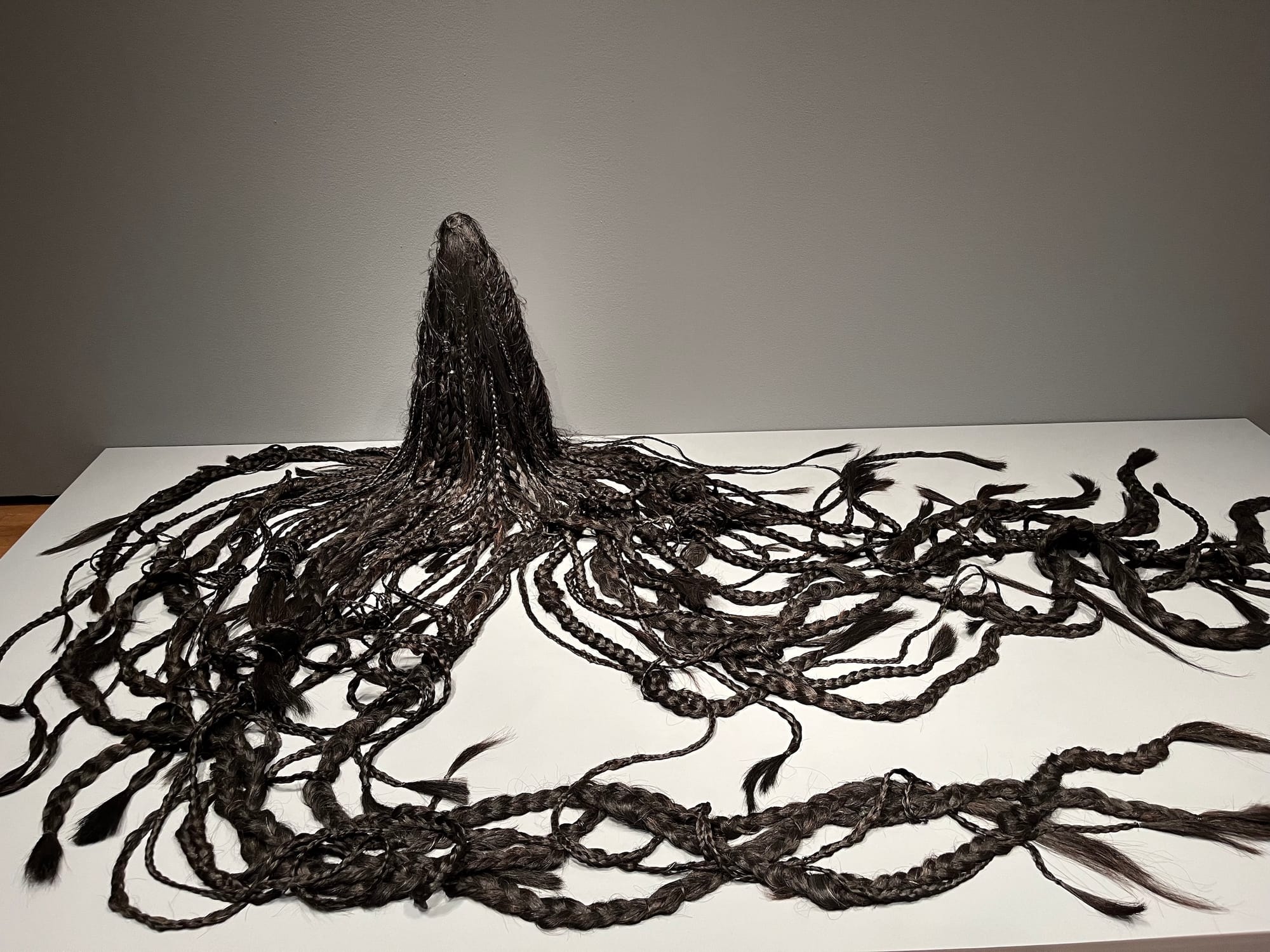 A nearby piece, “Untitled #918 (Kawabata)”(1997–98), is composed of horse hair. Huge braids snake and tangle on a low pedestal, as if they might wrap our ankles and pull us into a swampy netherworld. But aren’t braids innocent, cute, and paired with rosy cheeks? Or are those very braids an early lesson in compliance.