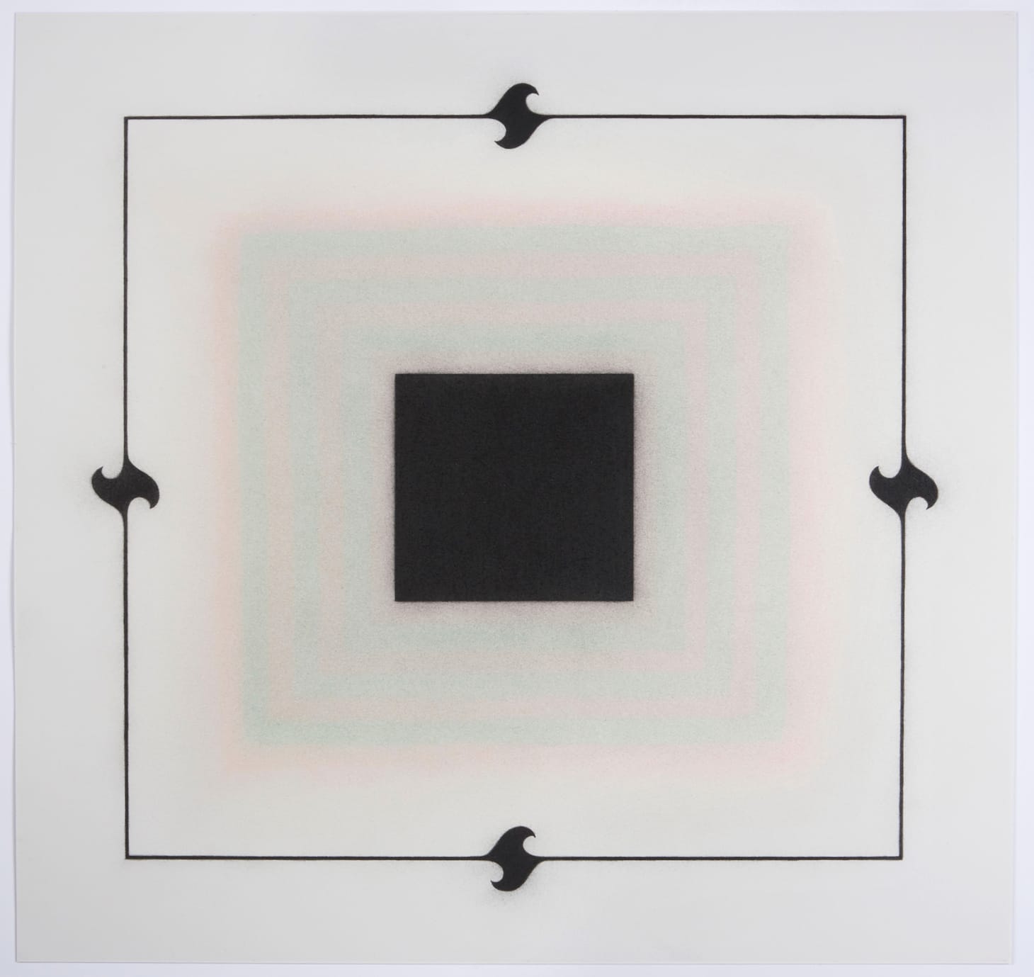 I like that Schulte combined seemingly incommensurable motifs derived from reductive geometric abstraction or decorative architectural details, that he could be self-contained or referential or both in the same drawing. I like the way that in some drawings a faint cloud of graphite dust had spread beyond the drawn form, like an exhalation. I like the way that each drawing pulls you closer and invites you to slow down your looking and contemplate carefully arranged accumulations of black and gray dust, to notice the shift in the density of the form and the pressure of the hand, to be open to contrast and tonal shifts, and the granular surface of a worked form.