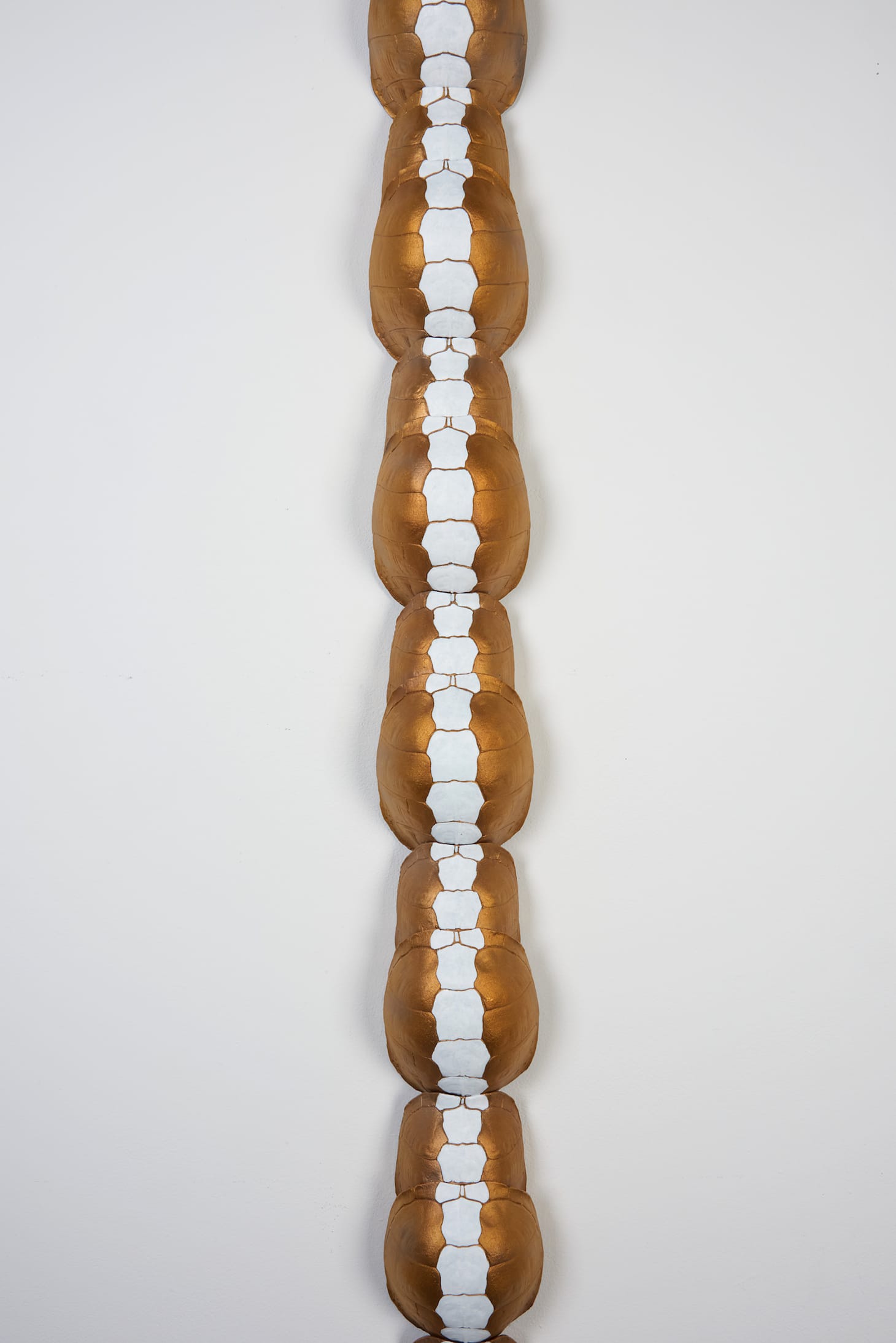 Schulte repeats the pair of turtle shells vertically until they become a column on the wall. (The larger shell appears to be humping the smaller one emerging from beneath it.) Running down the length of the shiny bronze is a repeated white, vertebrae-like shape the artist has painted. As the title suggests, “Slow Train (Braid VIII)” evokes a train moving across a flat landscape and a braid of hair.