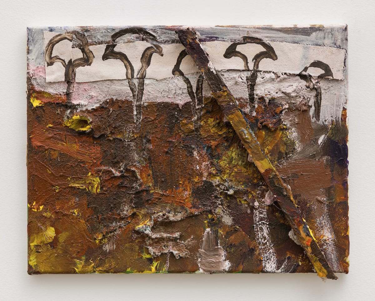 What is different about this exhibition is that Acheson is making paintings that seem to have little to do with what is going on today’s art world. In “Untitled” (2015), much of this horizontal, paint-encrusted work is composed of deep brown interrupted by smears of yellow and white. Was the artist applying paint or wiping off his brush on its wet surface? Does it matter? Above the dark brown, he has painted the upper third of the composition grayish-white — the color of a blizzard. The surface is uneven (as it is in the lower part), both thin and encrusted. On top of the grayish-white band and an overlaid white canvas strip, Acheson has painted the outline of five mushroom-like forms whose stems reach down into the encrusted brown below. Finally, he has affixed a strip of wood covered with patches of brown and yellow that starts at the bottom edge near the right-hand corner and rises to the middle of the top edge.