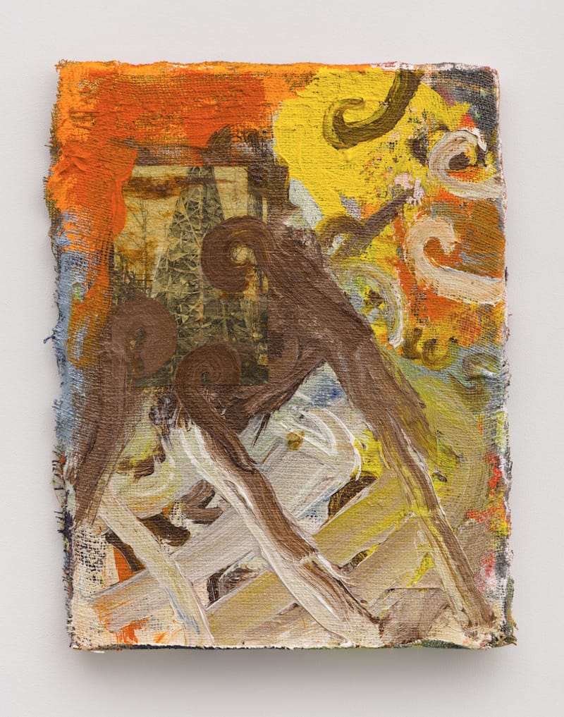 Peter Acheson does not want to be endearing or heroic. His modest-sized paintings are funky, matter-of-fact, tender, damaged, delicate, and crude. Often, he attaches blocks and pieces of splintered wood, strips of canvas, and other ungainly materials to the surface. He uses oil and acrylic. His paintings are recognizable but I would not say that he has a style. None of what he does seems to be in the service of beauty or refinement, all of which he is capable of, as manifest in the work he showed in 2005, more than a decade ago. If the phrase, “Look what the cat dragged in,” comes to mind, as it did when I was walking around the exhibition Peter Acheson: Paintings at Brennan & Griffin, the artist’s first show with this stalwart Lower East Side gallery, I think Acheson might counter with, “Yes, but then he dragged it back out.”