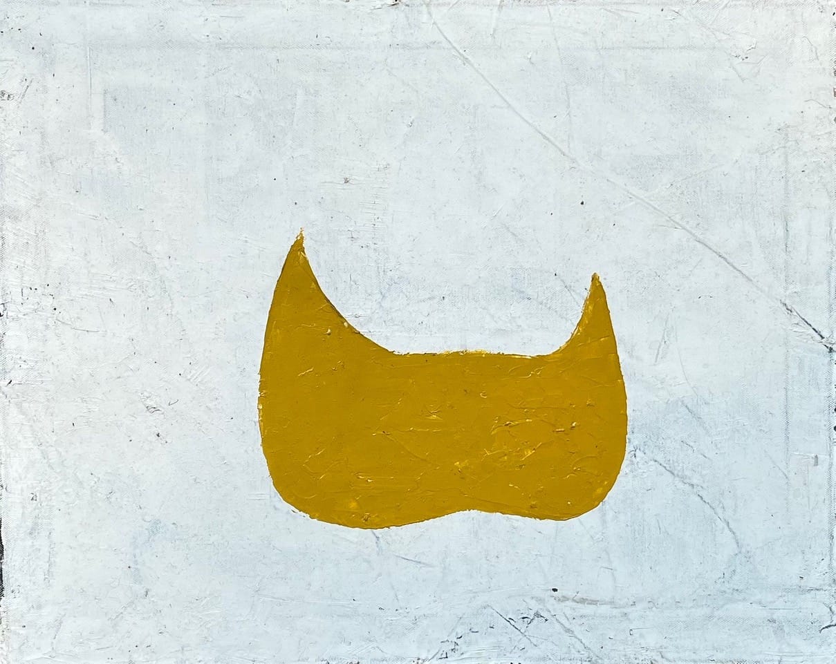 In “Votive 2 (for Myron Stout)” (2005), done more than a decade after “Votive,” a scrunched, brown-mustard, canoe-like shape floats on a dirty white ground faintly tinted with blue. As opposed to Stout, who often labored for years on his modestly scaled, black and white biomorphic abstractions, which allude to Greek mythology, Acheson offers the artist an imperfect object, which I take as a sign of humility.
